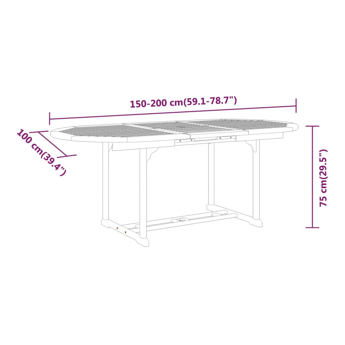 - Dimensions de la table : (150-200) x 100 x 75 cm (l x P x H)