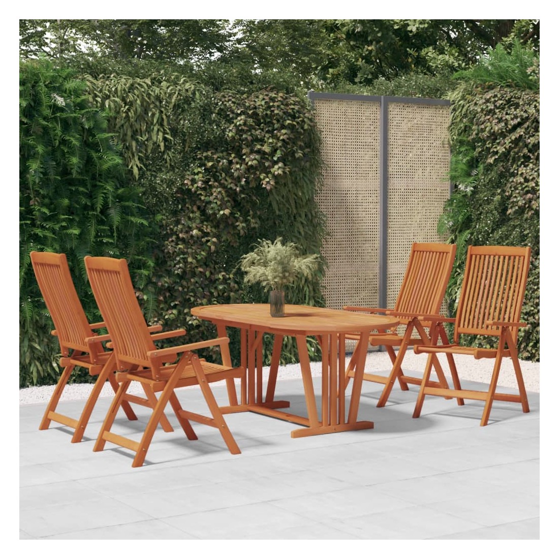Cet ensemble de salle à manger de jardin en bois a un design rustique et intemporel et sera un excellent choix pour manger dans le jardin ou sur la terrasse. Bois d'eucalyptus massif : le bois d'eucalyptus massif est un magnifique matériau naturel. Le bois d'eucalyptus est extrêmement dense et hydrofuge. Le matériau est bien connu pour sa riche couleur brun rougeâtre.Table à manger extensible : grâce à sa conception spéciale, cette table en bois peut être allongée lorsque de l'espace supplémentaire est nécessaire.Trou de parasol pratique : cette table d'extérieur dispose d'un trou de parasol pour fournir un endroit approprié pour votre parasol afin de vous aider à éviter la lumière du soleil et la pluie.Chaises inclinables en bois : les fauteuils de jardin sont dotés de sièges et de dossiers incurvés. De plus, le dossier peut être réglé en 5 positions, vous permettant ainsi de toujours trouver une position confortable.Design pliable : ces chaises de salle à manger peuvent être pliées pour économiser de l'espace lorsqu'elles ne sont pas utilisées. Vous pouvez facilement les transporter partout avec vous lors de vos voyages en plein air. Remarque :Afin de prolonger la durée de vie de votre mobilier d'extérieur, nous vous recommandons de le protéger avec une housse imperméable.