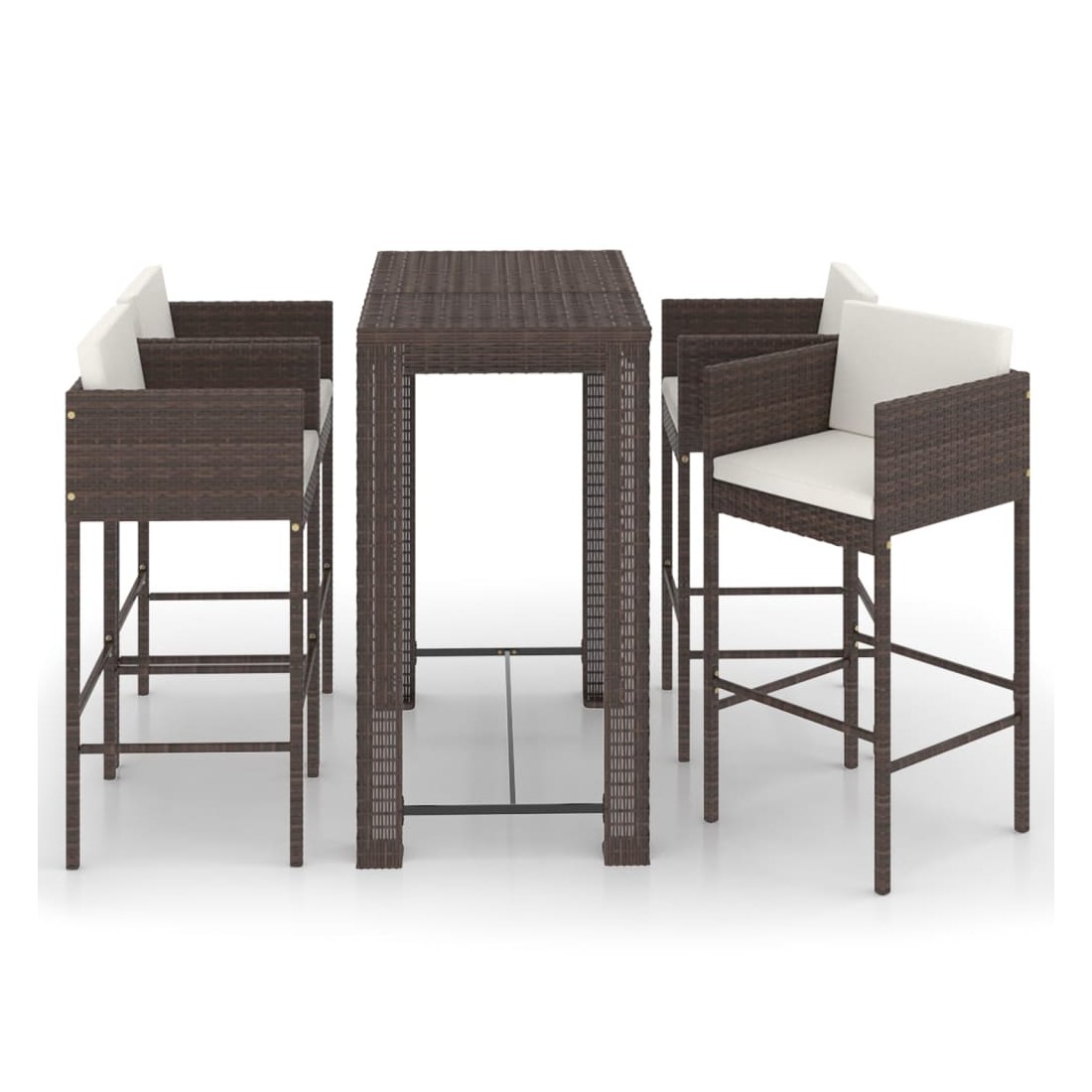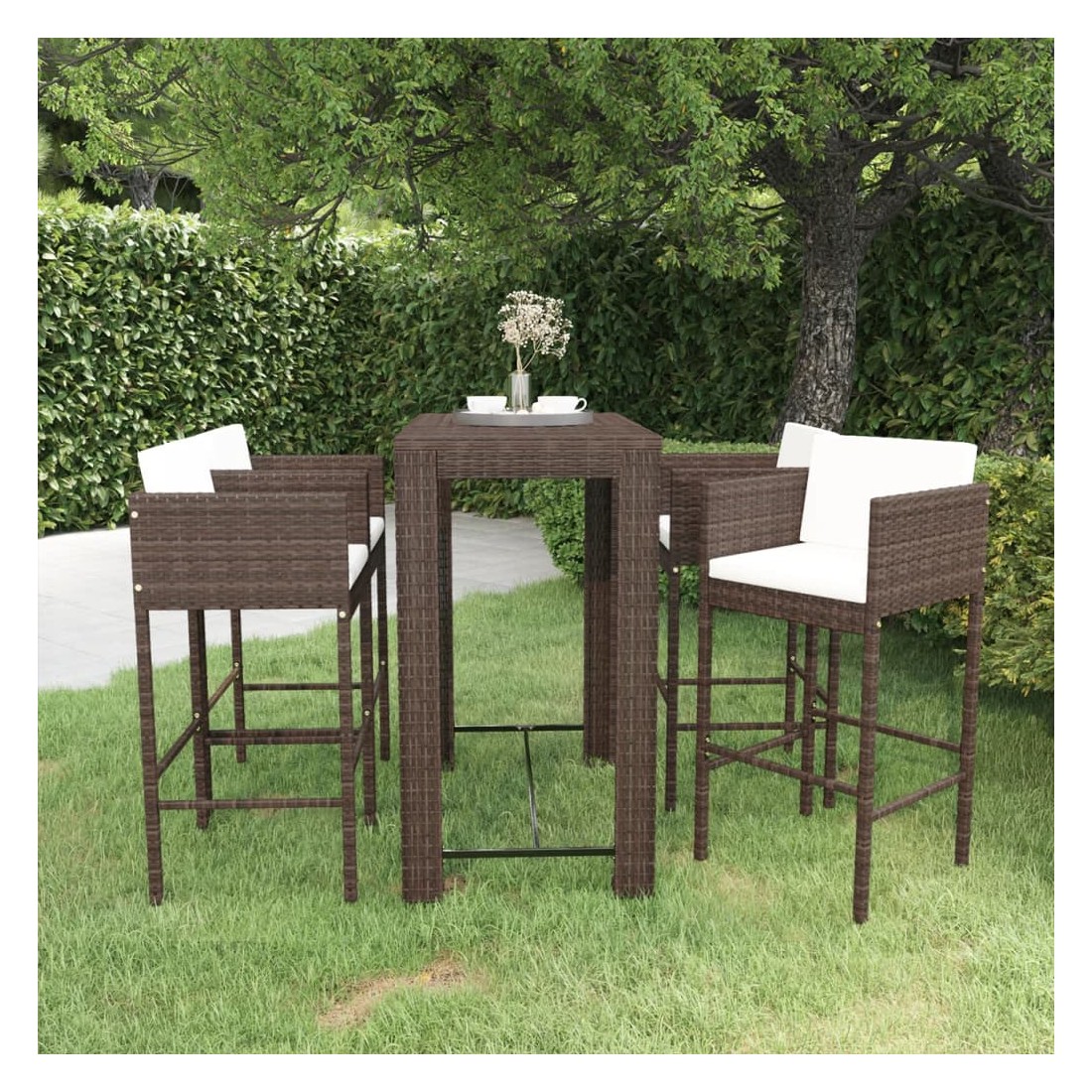 Cet ensemble élégant de bar de jardin vous permet de passer des moments agréables et confortables avec votre famille et vos amis. Fabriqué en résine tressée résistante aux intempéries et imperméable, cet ensemble de bar d'extérieur est facile à nettoyer, résistant à l'usure et adapté à un usage quotidien. Le cadre en acier enduit de poudre rend la table et les tabourets solides et durables. Le dessus de table est idéal pour placer des boissons, de la nourriture ou des objets décoratifs. Le repose-pied et les coussins ajoutent également un confort d'assise supplémentaire au tabouret. Grâce à la construction légère, tous les articles sont faciles à déplacer. Remarque : afin de prolonger la durée de vie des meubles d'extérieur, nous vous recommandons de les protéger avec une housse imperméable.
