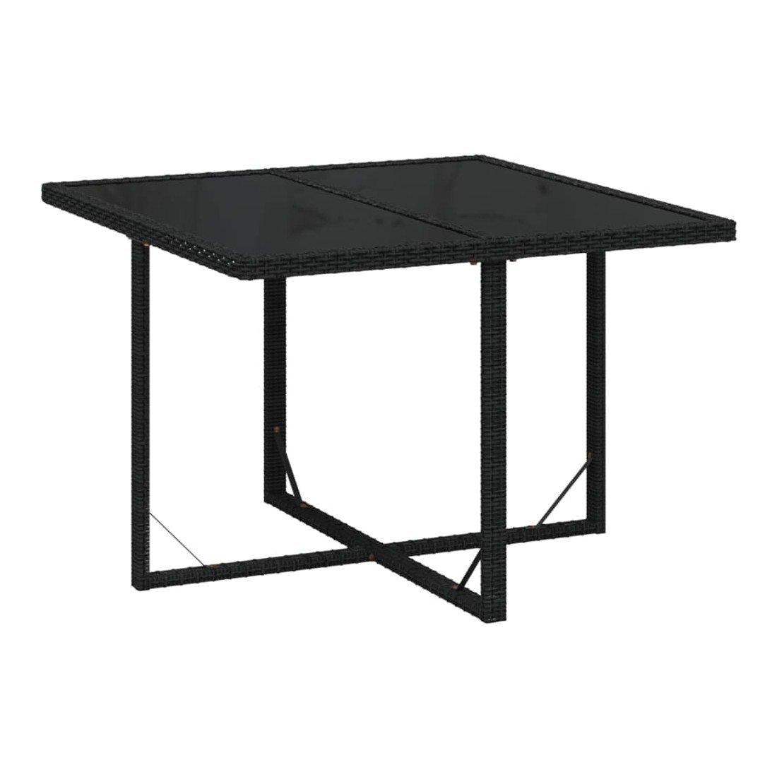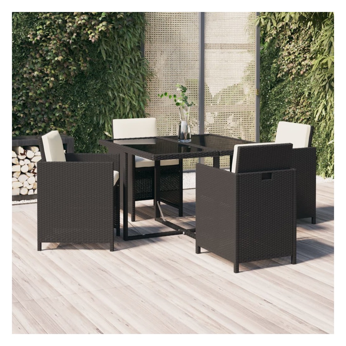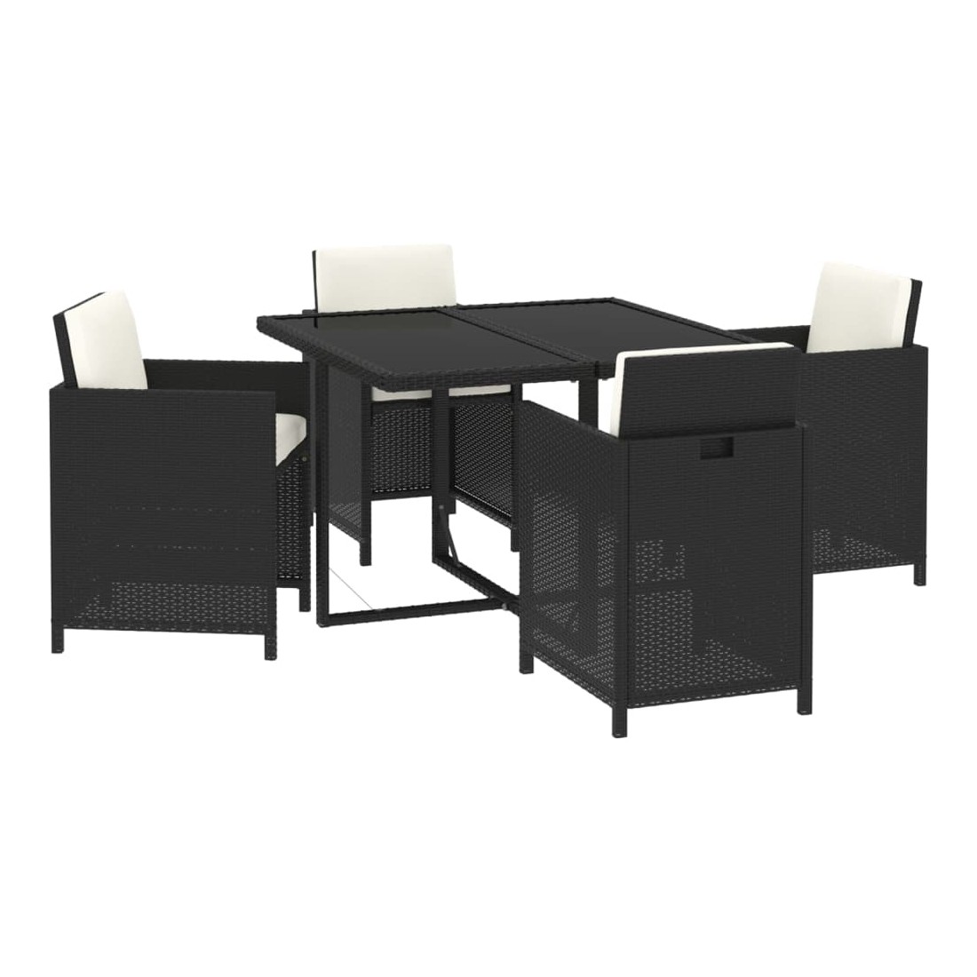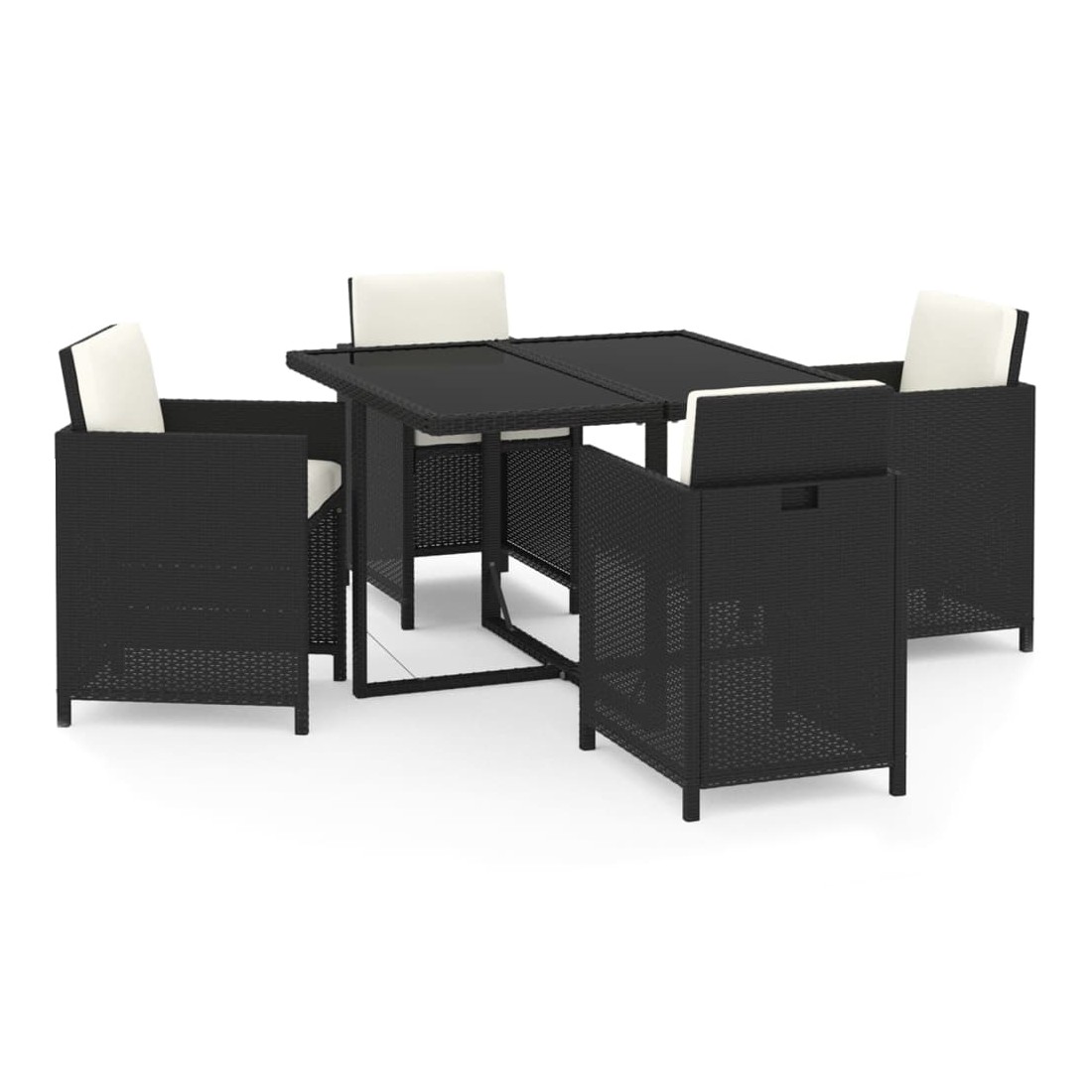 Ensemble repas de jardin en rotin noir avec coussins crème, alliant confort, style et praticité pour vos repas en extérieur.Matériaux résistants : Fabriqué en rotin PE résistant aux intempéries et à l’eau, avec structure en acier peint, cet ensemble est durable et facile à entretenir pour un usage quotidien.Confort optimal : Les chaises sont équipées de coussins d’assise et de dossier épais et rembourrés, assurant un confort supérieur lors de vos repas et moments de détente.Table pratique : Le plateau en verre trempé offre un support idéal pour boissons, repas ou décorations, facile à nettoyer et élégant.Gain de place : Les dossiers des chaises peuvent être rabattus et les chaises rangées sous la table, optimisant l’espace de rangement lorsque l’ensemble n’est pas utilisé.Dimensions ergonomiques : Table de 109 x 107 x 74 cm et chaises de 52 x 56 x 85 cm, avec assise de 46 x 41 cm à 45 cm du sol, offrant confort et praticité pour tous les utilisateurs. Profitez de repas conviviaux et d’un confort optimal avec cet ensemble de jardin élégant, durable et facile à déplacer.