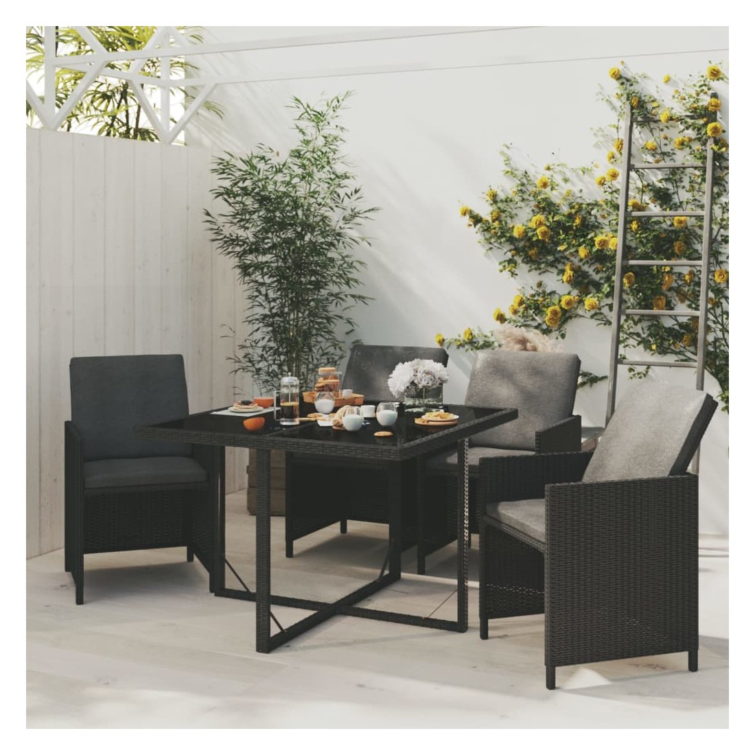 Cet ensemble élégant de salle à manger de jardin vous permet de passer des moments agréables et confortables avec votre famille et vos amis. Fabriqué en résine tressée résistante aux intempéries et imperméable, cet ensemble de salle à manger d'extérieur est facile à nettoyer, résistant à l'usure et adapté à une utilisation quotidienne. Le cadre en acier enduit de poudre rend la table et les chaises robustes et durables. Le dessus de table en verre est idéal pour placer des boissons, de la nourriture ou des objets décoratifs. Les coussins d'assise et de dossier épais et souples, remplis de mousse, ajoutent également au confort d'assise. De plus, vous pouvez tirer le dossier vers le bas et ranger les chaises sous la table, économisant ainsi un espace de rangement précieux lorsque l’ensemble n’est pas utilisé. Grâce à la construction légère, tous les articles sont faciles à déplacer. Remarque : afin de prolonger la durée de vie des meubles d'extérieur, nous vous recommandons de les protéger avec une housse imperméable.
