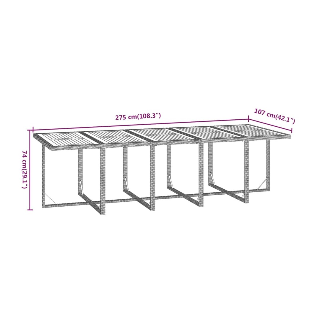 - Dimensions totales de la table : 275 x 107 x 74 cm (L x l x H)