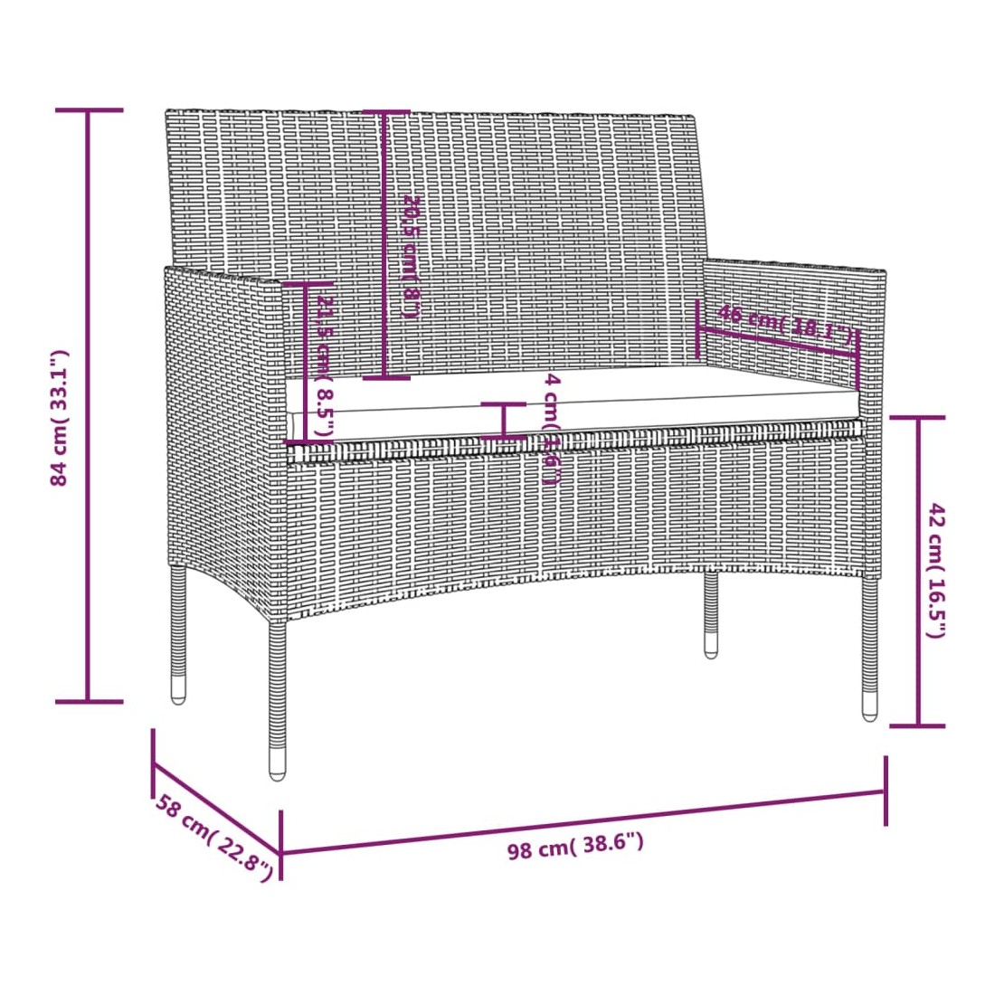 • Dimensions du canapé à 2 places : 98 x 58 x 84 cm (l x P x H)