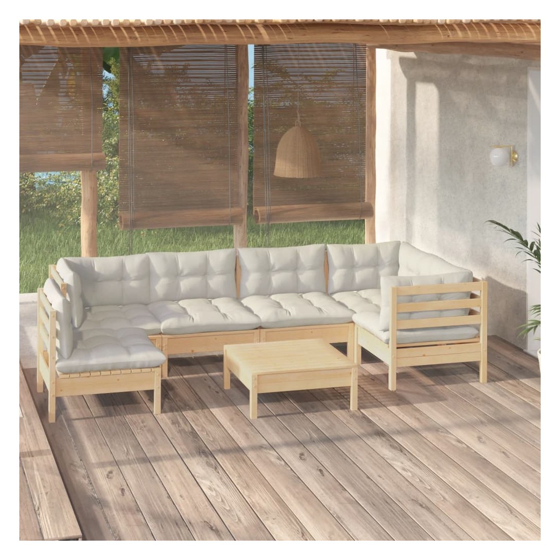 Salon de jardin 7 pcs avec coussins crème bois de pin