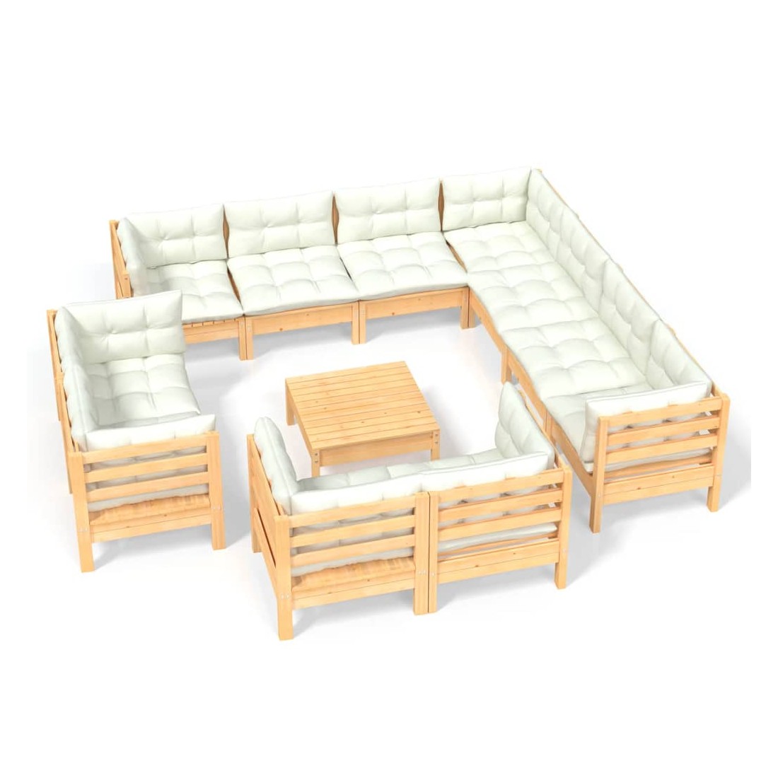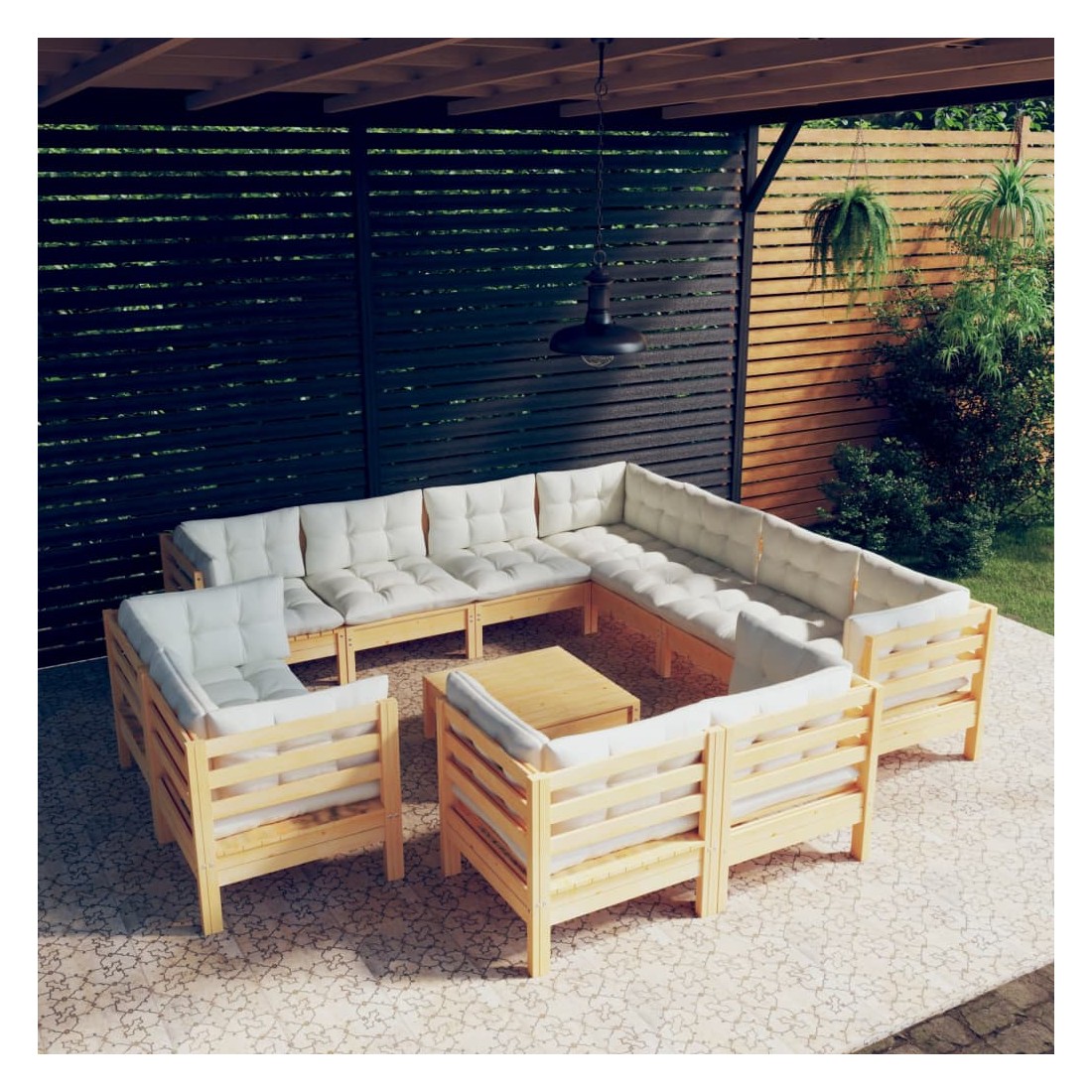 Salon de jardin 12 pcs avec coussins crème Bois de pin massif