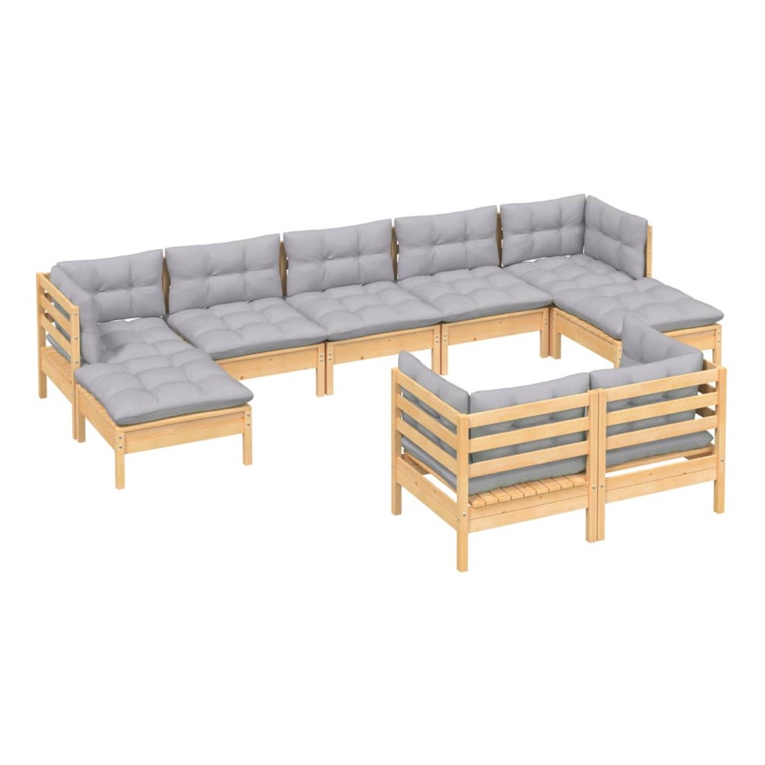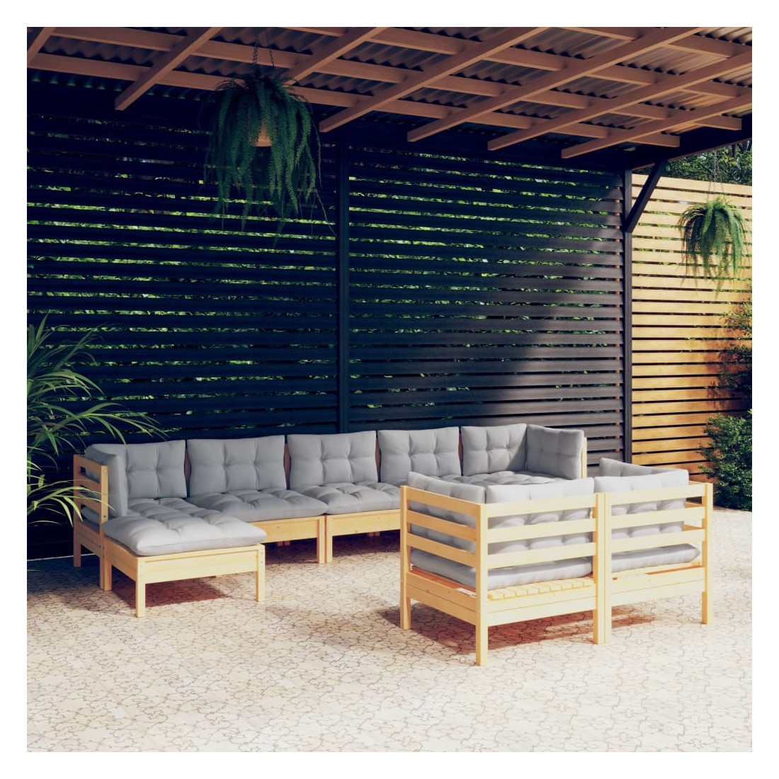 Salon de jardin 9 pcs avec coussins gris bois de pin massif