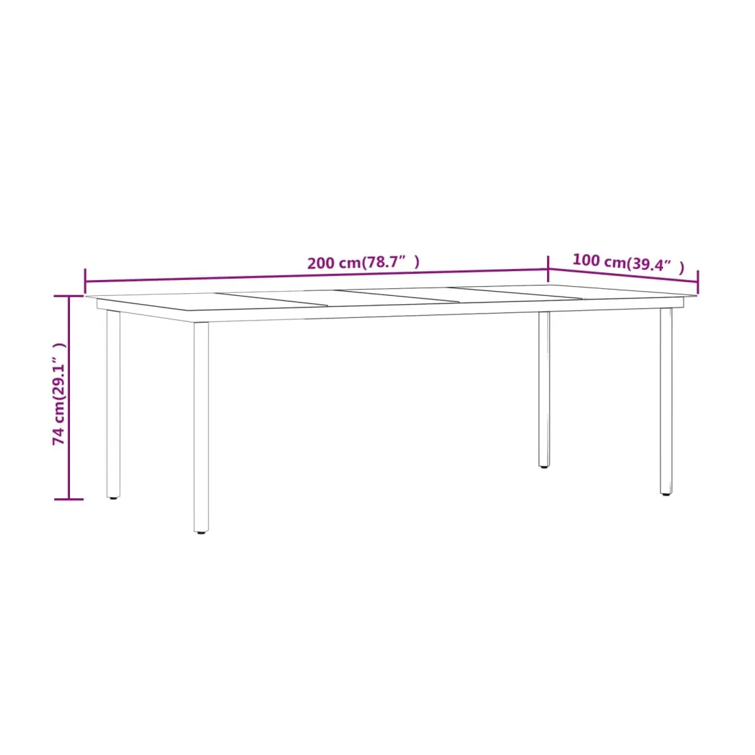 - Dimensions de la table : 200 x 100 x 74 cm (L x l x H)