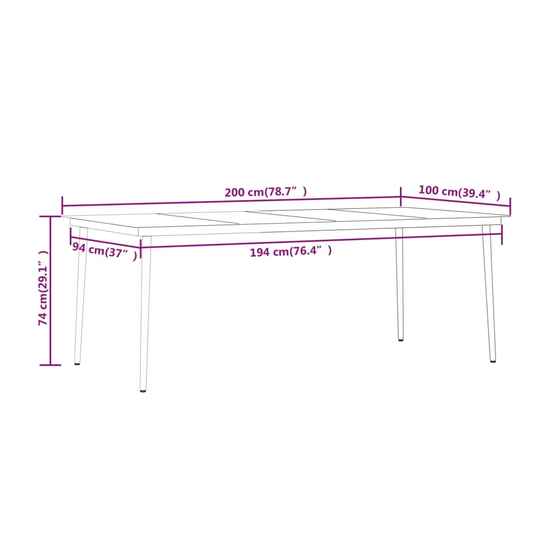 • Dimensions de la table : 200 x 100 x 74 cm (L x l x H)