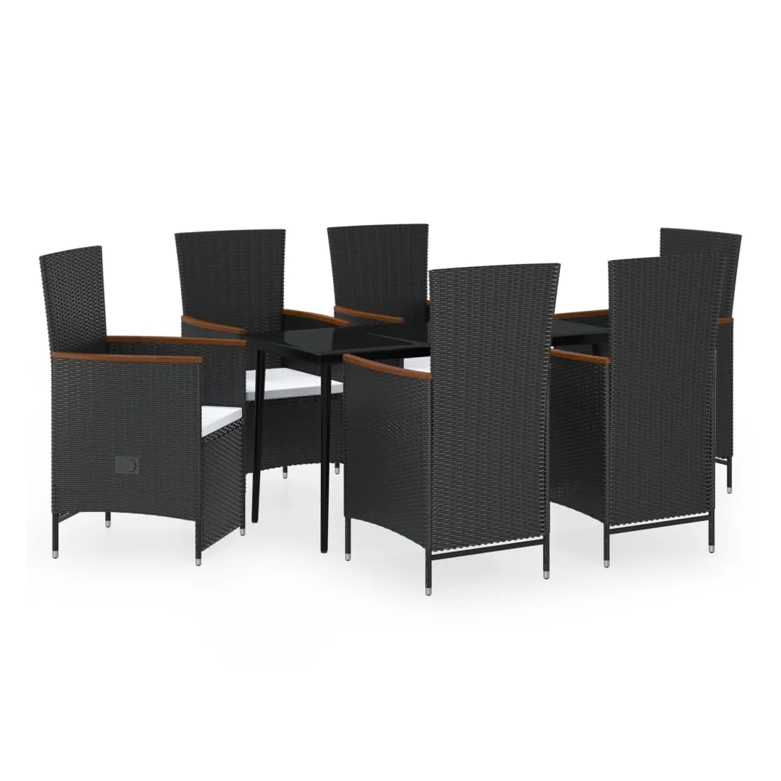 Cet élégant ensemble de salle à manger de jardin est destiné à être le point de mire de votre jardin ou patio ! C'est un excellent choix pour les repas en plein air ou pour vous détendre dans l'espace extérieur ! Les cadres en acier enduit de poudre rendent la table et les chaises robustes et stables pour une utilisation quotidienne à l'extérieur. Grâce à la résine tressée résistante à l'eau, les chaises sont faciles à nettoyer et résistantes à l'usure. Le dossier et le repose-pied peuvent être ajustés en tirant sur le bouton sur le côté. Grâce à leur fabrication légère, elles sont faciles à déplacer. Les coussins de siège bien rembourrés ajoutent également un confort supplémentaire. Les housses en polyester nécessitant peu d'entretien peuvent être retirées et lavées. De plus, le dessus de table en verre lisse est facile à nettoyer avec un chiffon humide et parfait pour ranger repas, boissons et autres articles décoratifs. Remarque : afin de prolonger la durée de vie des meubles d'extérieur, nous vous recommandons de les protéger avec une housse imperméable.