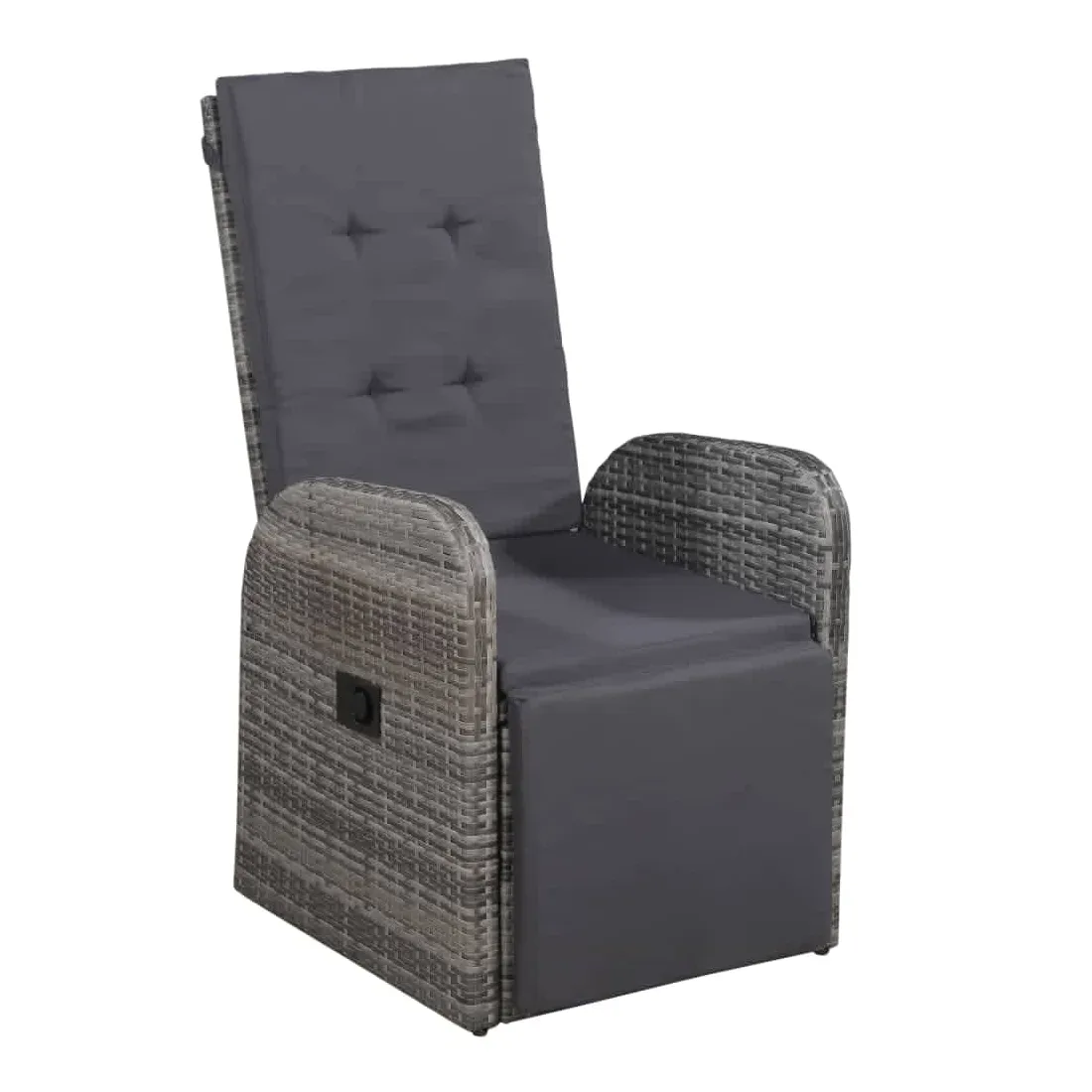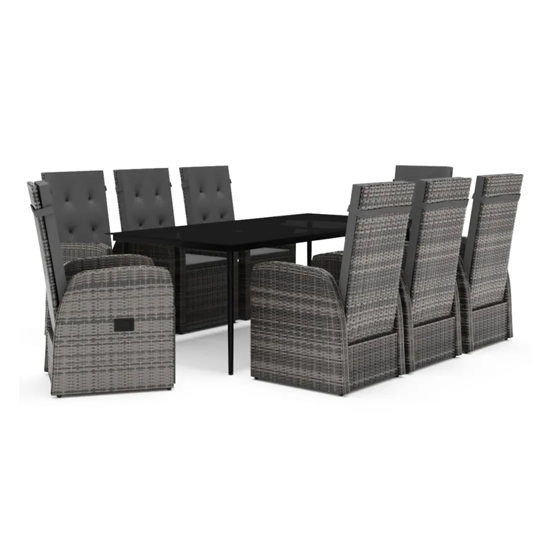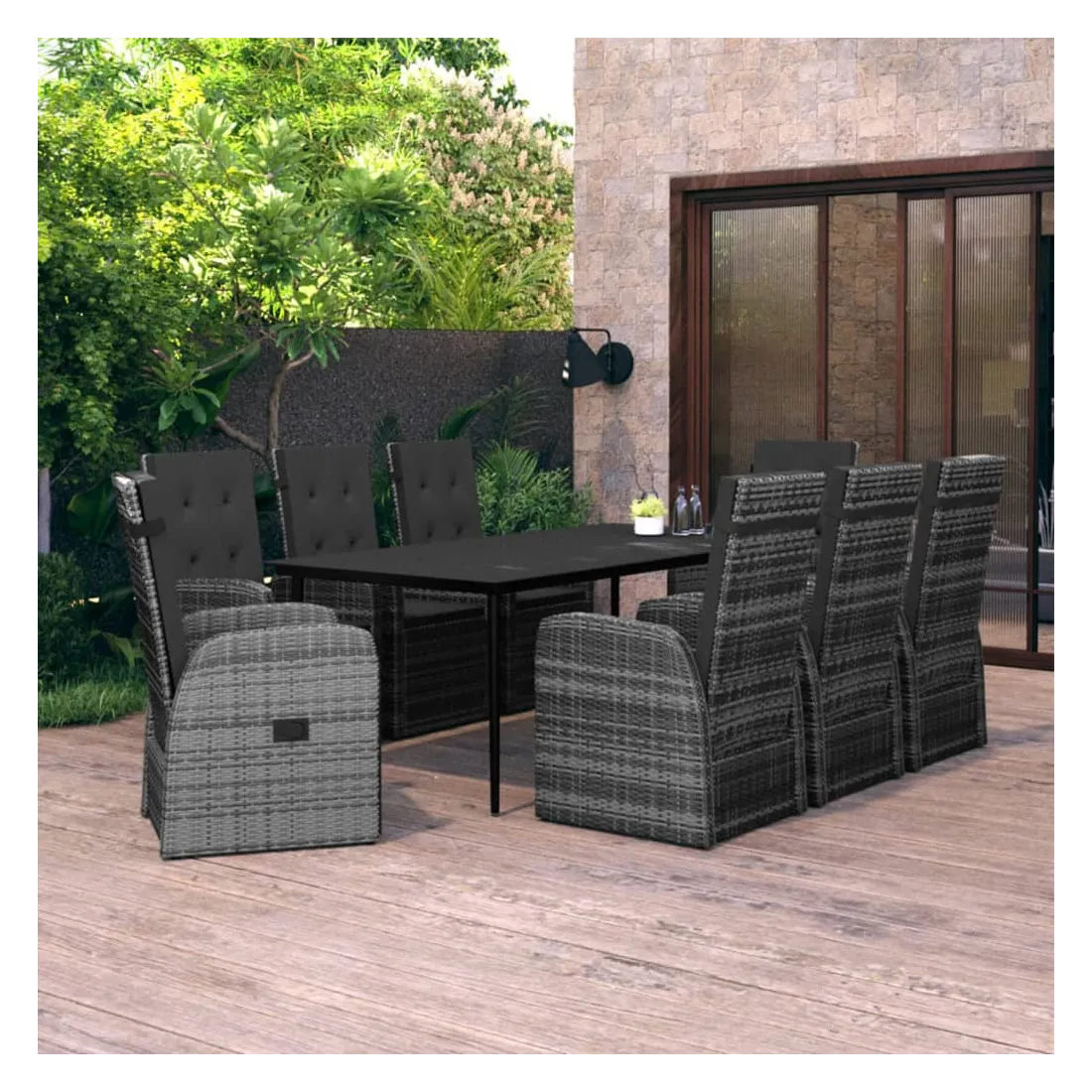 Cet élégant ensemble de salle à manger de jardin est destiné à être le point de mire de votre jardin ou patio ! C'est un excellent choix pour les repas en plein air ou pour vous détendre dans l'espace extérieur ! Les cadres en acier enduit de poudre rendent la table et les chaises robustes et stables pour une utilisation quotidienne à l'extérieur. Grâce à la résine tressée résistante à l'eau, les chaises sont faciles à nettoyer et résistantes à l'usure. Le dossier et le repose-pied peuvent être ajustés en tirant sur le bouton sur le côté. Grâce à leur fabrication légère, elles sont faciles à déplacer. Les coussins de siège bien rembourrés ajoutent également un confort supplémentaire. Les housses en polyester nécessitant peu d'entretien peuvent être retirées et lavées. De plus, le dessus de table en verre lisse est facile à nettoyer avec un chiffon humide et parfait pour ranger repas, boissons et autres articles décoratifs. Remarque : afin de prolonger la durée de vie des meubles d'extérieur, nous vous recommandons de les protéger avec une housse imperméable.