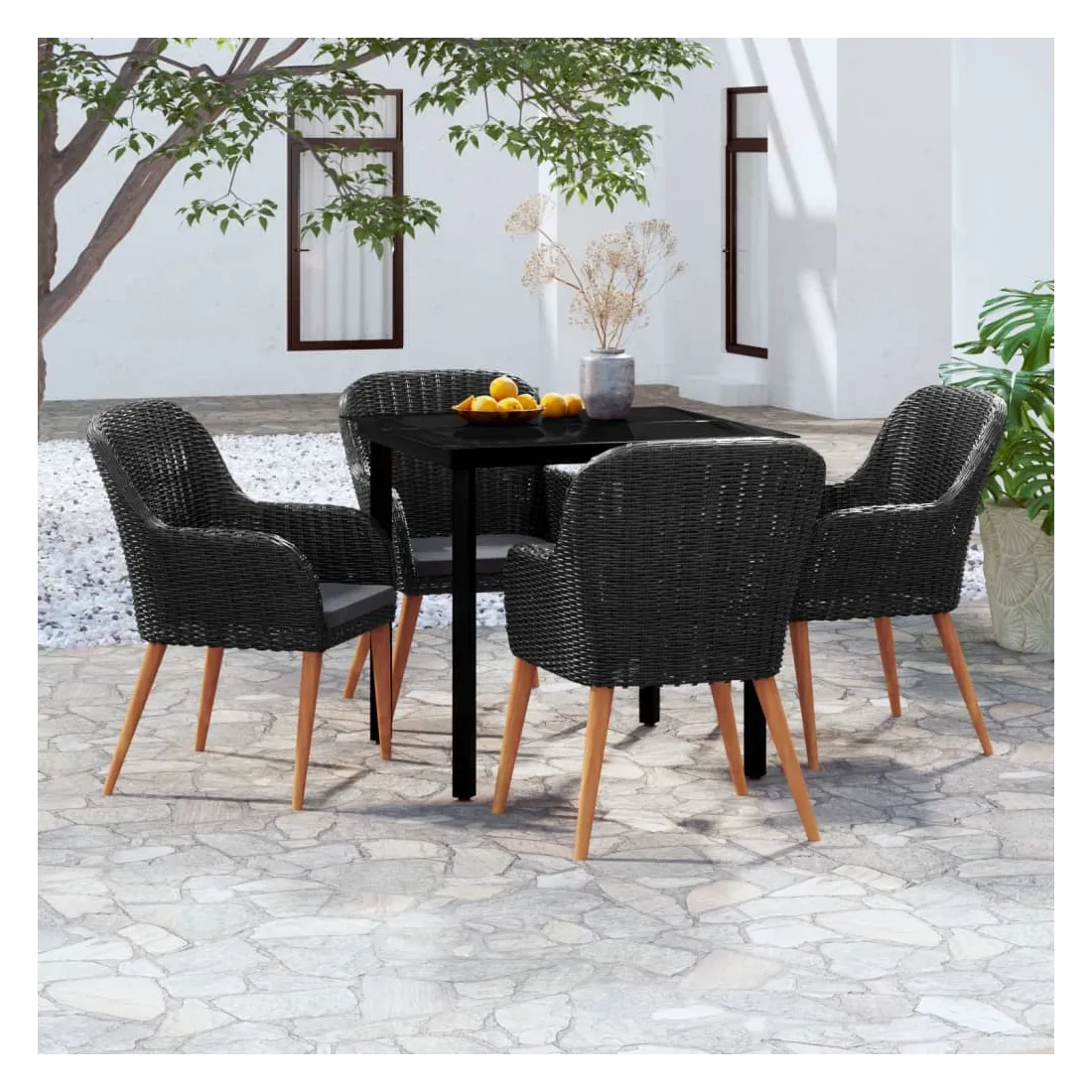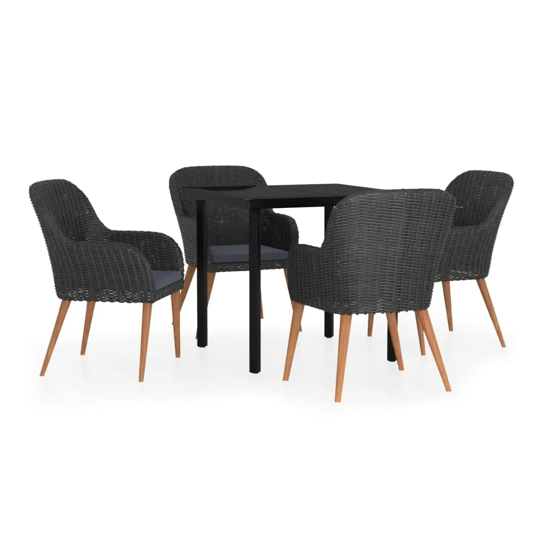 - Matériau : résine tressée, acier enduit de poudre, bois d'acacia massif avec une finition huilée, verre
