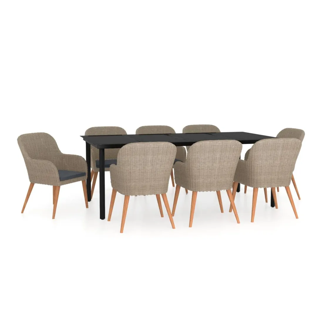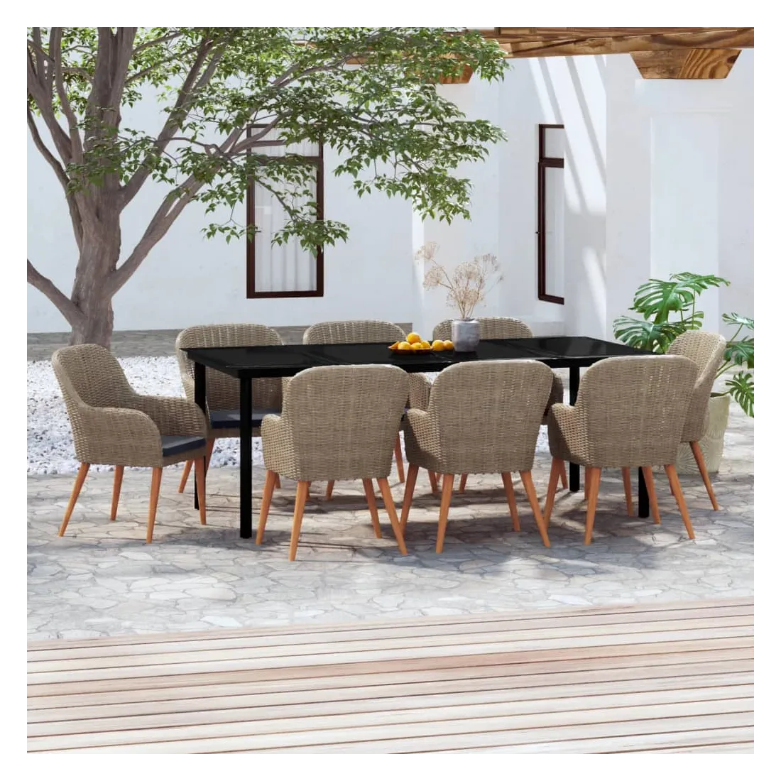 • Matériau : résine tressée, acier enduit de poudre, bois d'acacia massif avec une finition huilée, verre