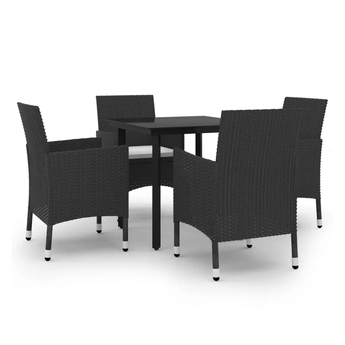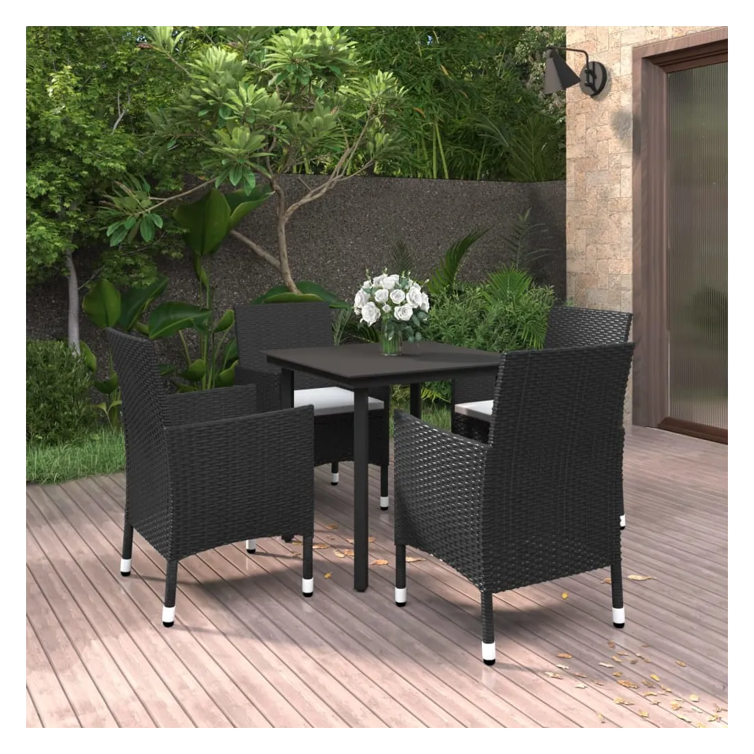 Cet ensemble élégant de salle à manger de jardin vous permet de passer des moments agréables et confortables avec votre famille et vos amis. Le cadre en acier enduit de poudre rend la table et les chaises robustes et durables. Fabriquées en résine tressée résistante aux intempéries et imperméable, les chaises sont faciles à nettoyer, résistantes à l'usure et adaptées à un usage quotidien. Le dessus de table en verre lisse est idéal pour poser des boissons, de la nourriture ou des objets décoratifs. De plus, le coussin de siège bien rembourré ajoute un confort supplémentaire aux chaises. Remarque : afin de prolonger la durée de vie des meubles d'extérieur, nous vous recommandons de les protéger avec une housse imperméable.
