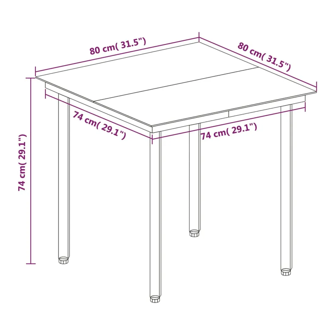 - Dimensions de la table : 80 x 80 x 74 cm (L x I x H)
