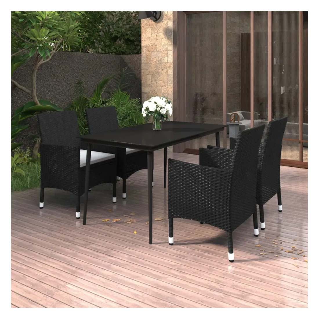 Cet ensemble élégant de salle à manger de jardin vous permet de passer des moments agréables et confortables avec votre famille et vos amis. Le cadre en acier enduit de poudre rend la table et les chaises robustes et durables. Fabriquées en résine tressée résistante aux intempéries et imperméable, les chaises sont faciles à nettoyer, résistantes à l'usure et adaptées à un usage quotidien. Le dessus de table en verre lisse est idéal pour poser des boissons, de la nourriture ou des objets décoratifs. De plus, le coussin de siège bien rembourré ajoute un confort supplémentaire aux chaises. Remarque : afin de prolonger la durée de vie des meubles d'extérieur, nous vous recommandons de les protéger avec une housse imperméable.