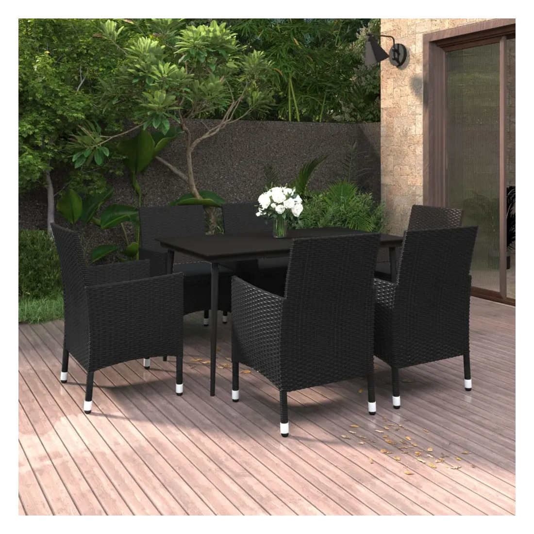 Cet ensemble élégant de salle à manger de jardin vous permet de passer des moments agréables et confortables avec votre famille et vos amis. Le cadre en acier enduit de poudre rend la table et les chaises robustes et durables. Fabriquées en résine tressée résistante aux intempéries et imperméable, les chaises sont faciles à nettoyer, résistantes à l'usure et adaptées à un usage quotidien. Le dessus de table en verre lisse est idéal pour poser des boissons, de la nourriture ou des objets décoratifs. De plus, le coussin de siège bien rembourré ajoute un confort supplémentaire aux chaises. Remarque : afin de prolonger la durée de vie des meubles d'extérieur, nous vous recommandons de les protéger avec une housse imperméable.