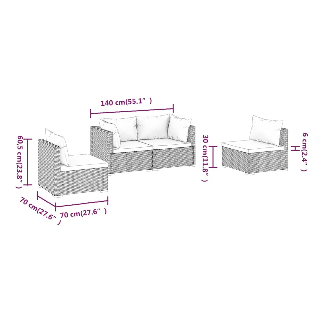 Profitez de votre temps de détente sur cet ensemble de salon de jardin tendance ! Il peut répondre à une variété de besoins différents. Cadre robuste : cet ensemble de meubles de patio est doté d'un cadre solide en acier enduit de poudre et de pieds en plastique chromé, ce qui est très durable.Matériau haut de gamme : l'ensemble de canapés de jardin est conçu avec de la résine tressée résistante à l'eau, ce qui le rend facile à nettoyer, résistant à l'usure et adapté à une utilisation quotidienne à l'extérieur.Design modulaire : la conception modulaire permet de placer l'ensemble dans n'importe quelle disposition ou de le combiner avec d'autres segments modulaires pour répondre à vos besoins.Confort d'assise accru : les coussins et les oreillers bien rembourrés et amovibles offrent un confort optimal pour votre expérience d'assise à l'extérieur. Remarque :Afin de prolonger la durée de vie de votre mobilier d'extérieur, nous vous recommandons de le protéger avec une housse imperméable.