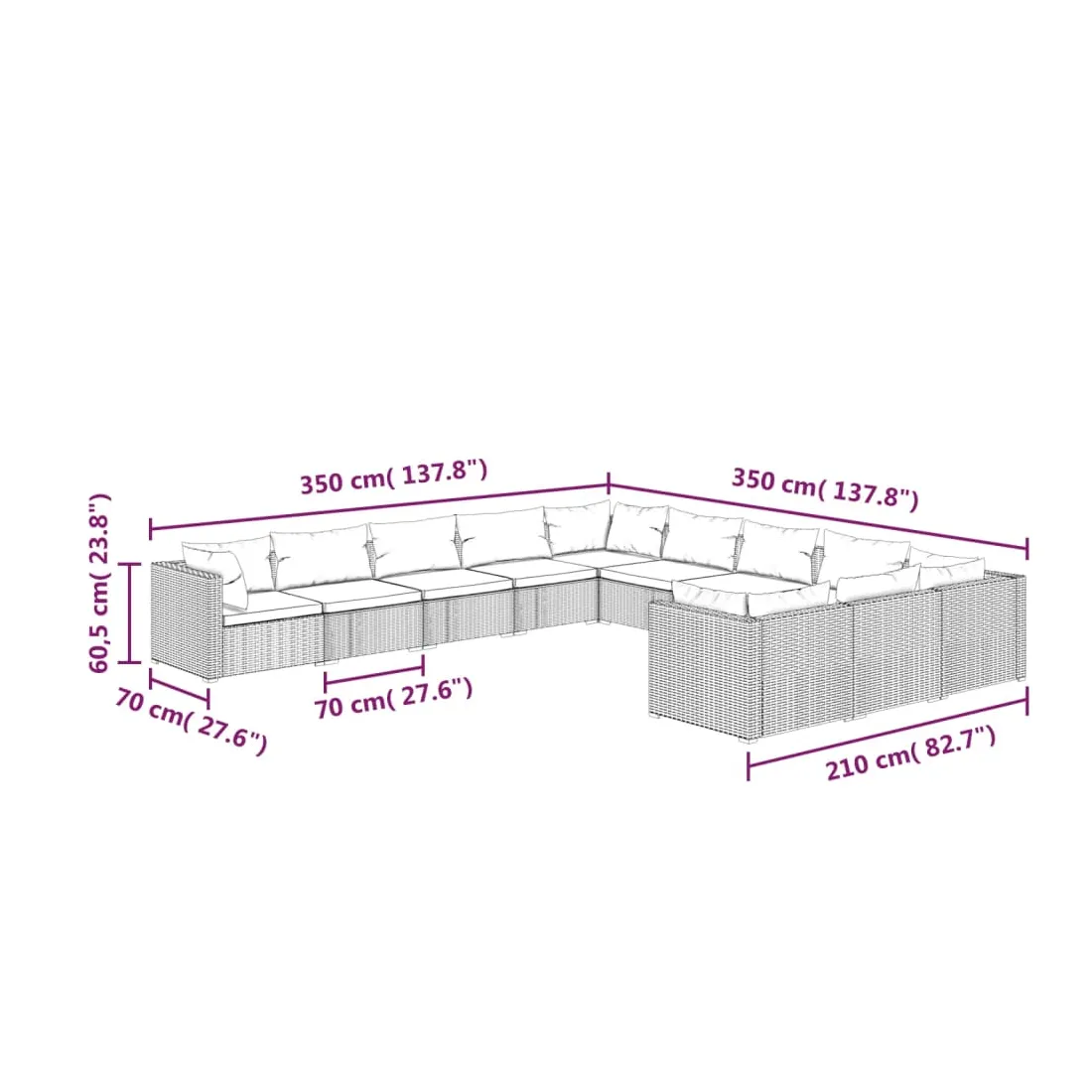 - Dimensions de chaque canapé : 70 x 70 x 60,5 cm (L x l x H)