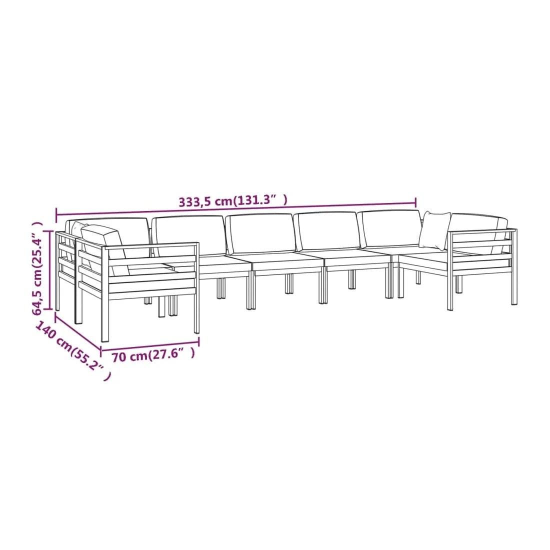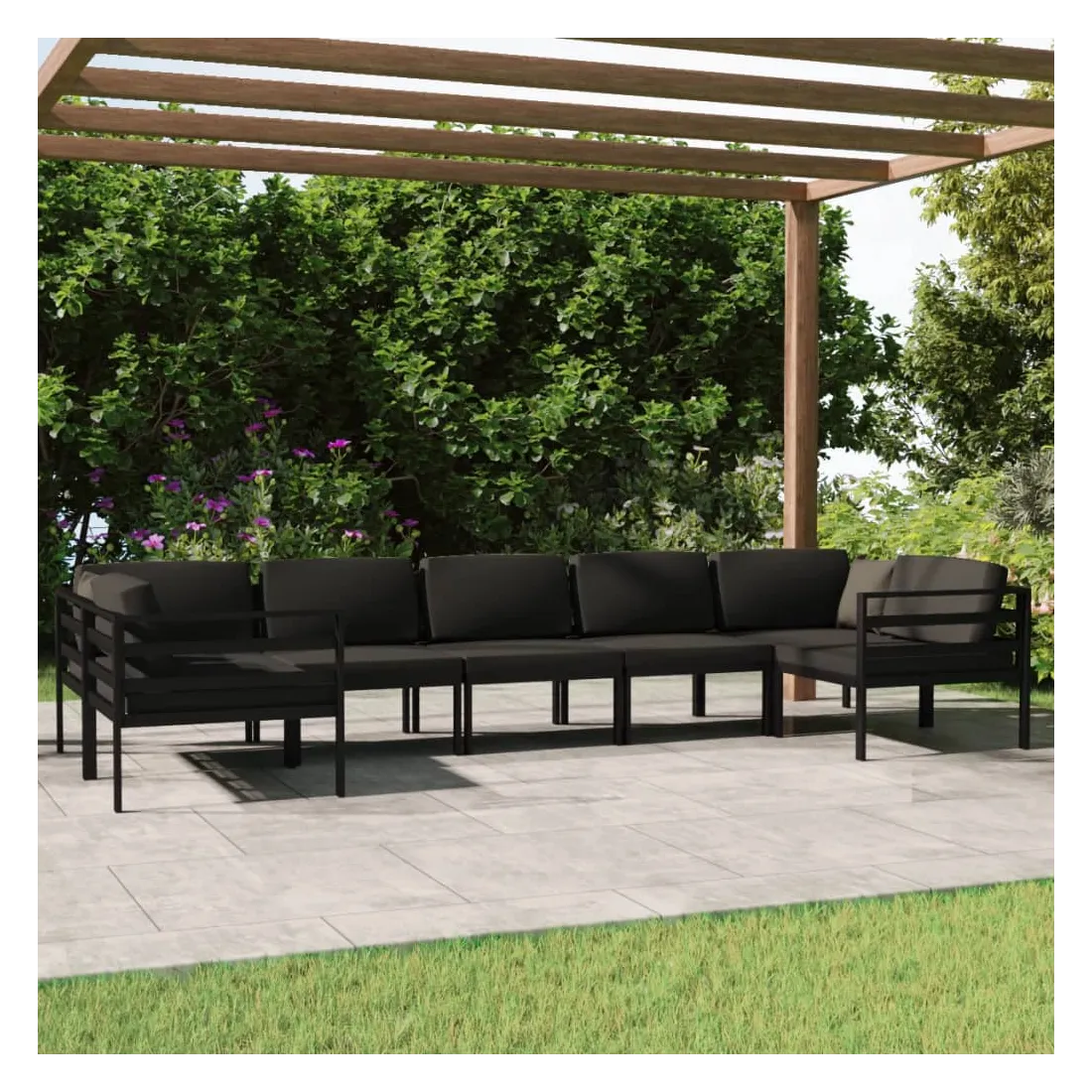 Alliant style et fonctionnalité, ce salon de jardin en aluminium vous offre un endroit parfait pour vous détendre et profiter du plus grand confort possible. Design modulaire : cet ensemble de salon de patio présente une conception modulaire qui vous permet de combiner ses sections modulaires dans différentes configurations, selon vos goûts !Matériau haut de gamme : fabriqué en aluminium, l'ensemble de salon d'extérieur est résistant aux intempéries et robuste. La construction légère facilite son déplacement.Coussins et oreillers confortables : les coussins de siège et les oreillers de dossier sont inclus pour votre confort. Remarque :Afin de prolonger la durée de vie de votre mobilier d'extérieur, nous vous recommandons de le protéger avec une housse imperméable.