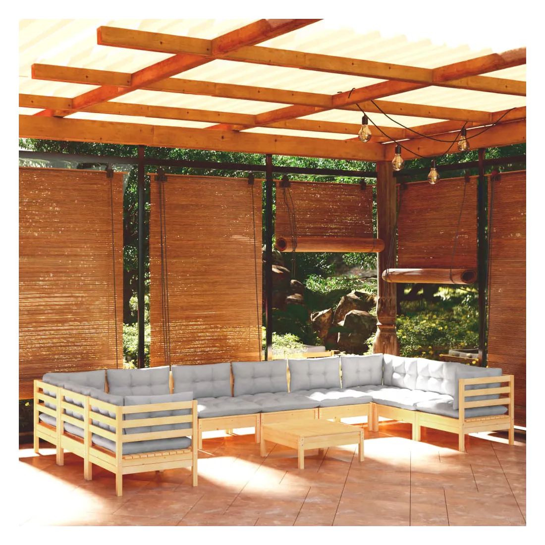 Cet ensemble de salon de jardin en bois est un choix excellent pour vous détendre et profiter du bon temps, faire une sieste ou discuter avec votre famille ou vos amis. Le salon de patio est fabriqué en bois de pin massif, ce qui le rend robuste et stable. Les coussins ajoutent un confort supplémentaire. Vous pouvez le combiner avec d’autres segments modulaires pour créer vos propres configurations de salon de jardin ! Remarque : afin de prolonger la durée de vie des meubles d'extérieur, nous vous recommandons de les protéger avec une housse imperméable.