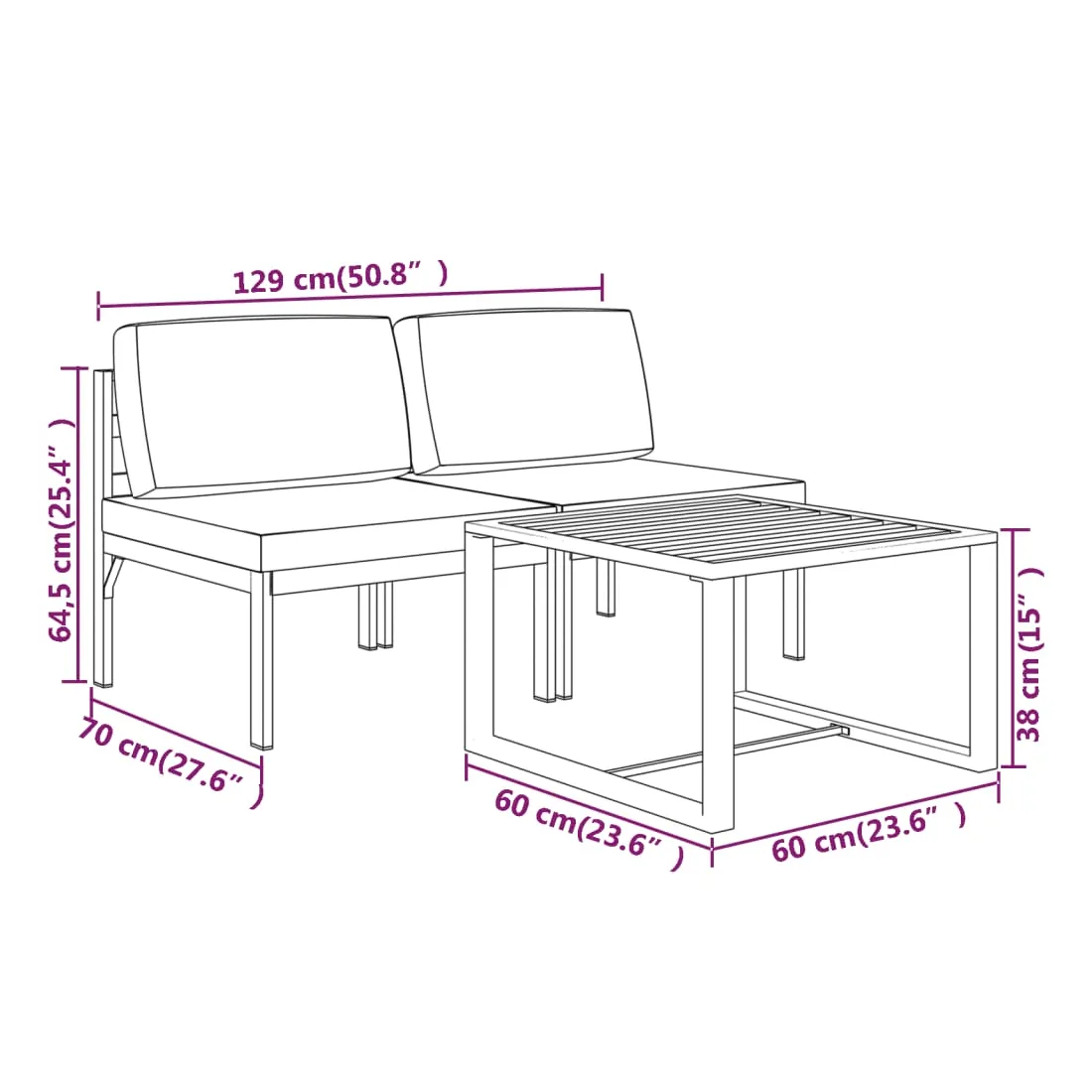 - Dimensions du canapé central : 64,5 x 70 x 64,5 cm (l x P x H)