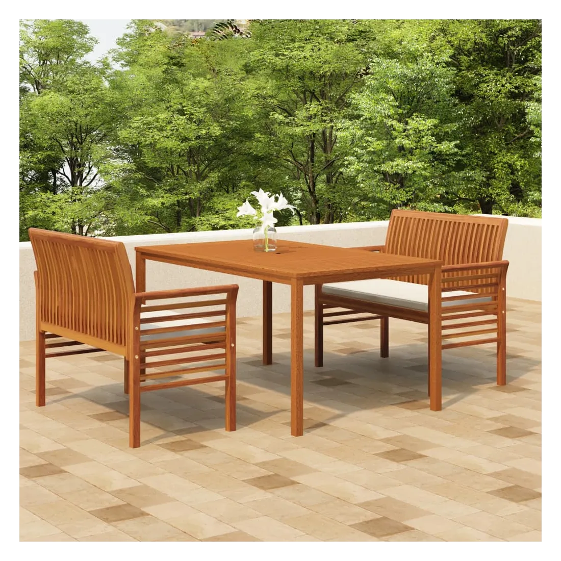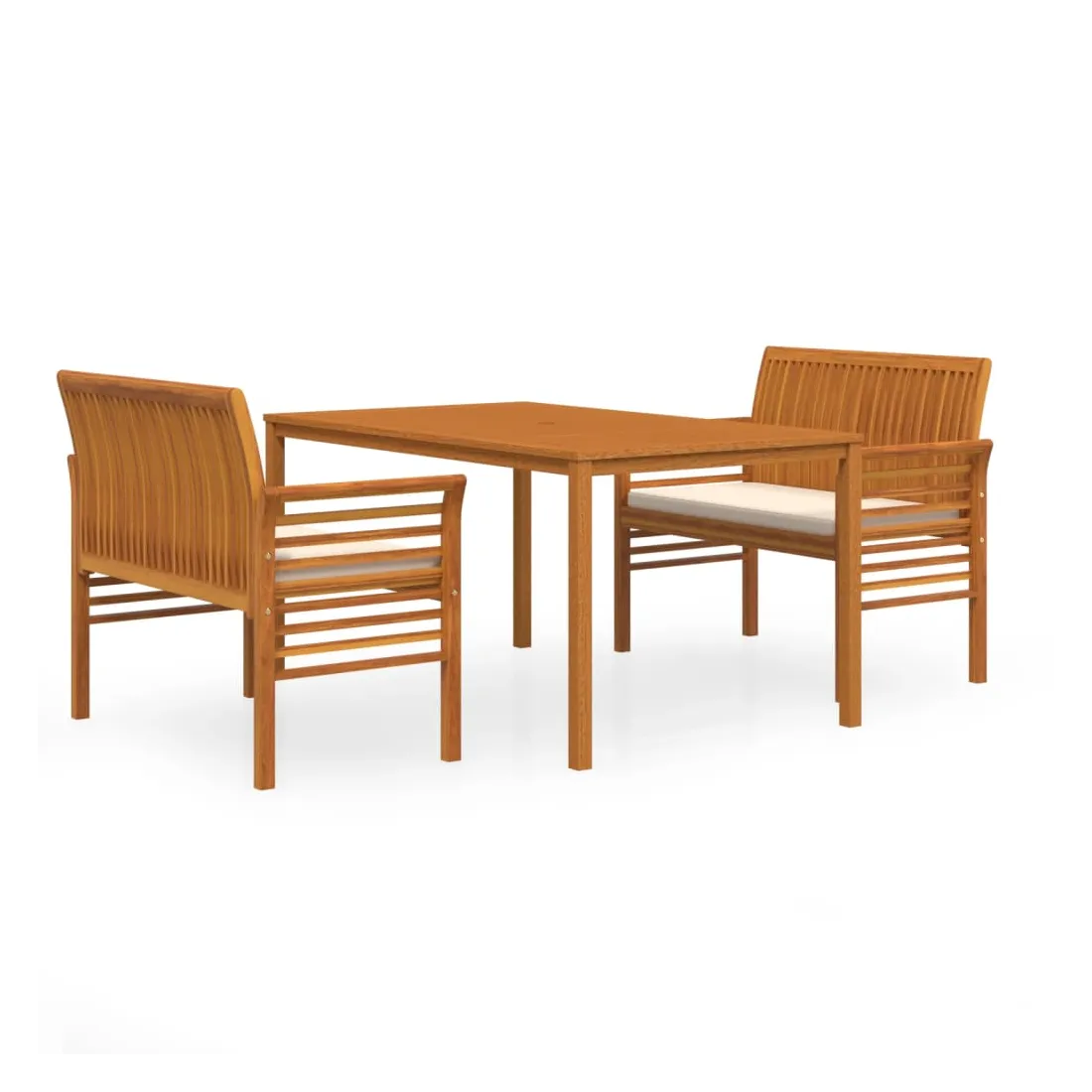 Cet ensemble de salle à manger d'extérieur classique en bois est un excellent choix pour manger et vous détendre avec votre famille et vos amis dans le jardin ou sur la terrasse. Bois d'acacia massif : le bois d'acacia massif est un matériau naturel magnifique. Le bois d'acacia un bois dur tropical, qui est dense, robuste et durable.Cadre robuste et stable : le cadre en bois assure robustesse et stabilité.Design confortable : les dossiers et les accoudoirs légèrement incurvés ajoutent un confort d'assise supplémentaire pour les bancs. De plus, les coussins épais et amovibles offrent un confort optimal pour votre temps d'assise en plein air.Dessus de table robuste : le dessus de table robuste avec un design à lattes offre suffisamment d'espace pour mettre vos collations, paniers de fruits, objets décoratifs, ainsi que d'autres articles essentiels. Remarque :Afin de prolonger la durée de vie de votre mobilier d'extérieur, nous vous recommandons de le protéger avec une housse imperméable.Chaque produit est livré avec un manuel de montage dans la boîte pour un montage facile.