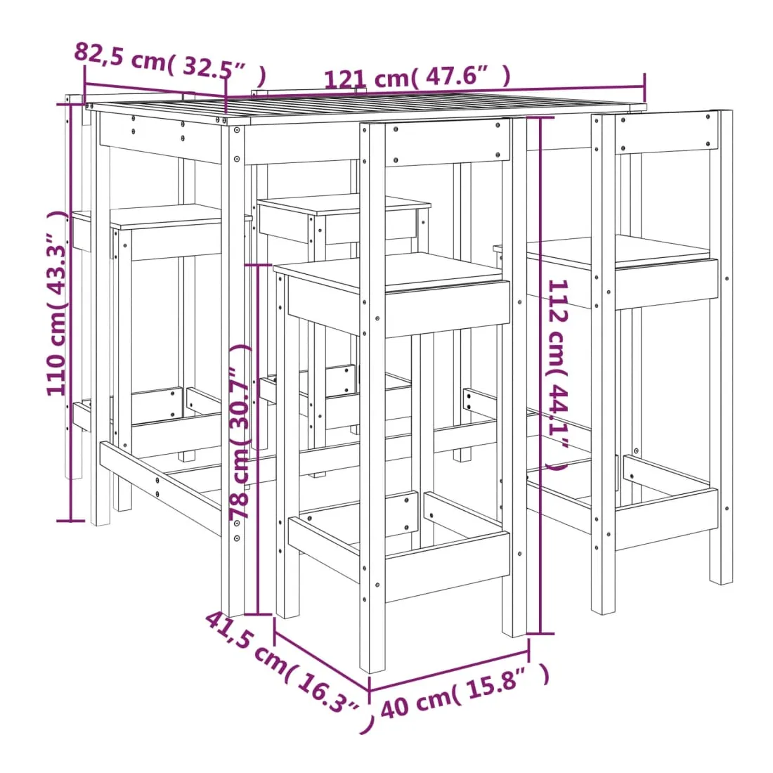• Dimensions de la table de bar : 121 x 82,5 x 110 cm (l x P x H)