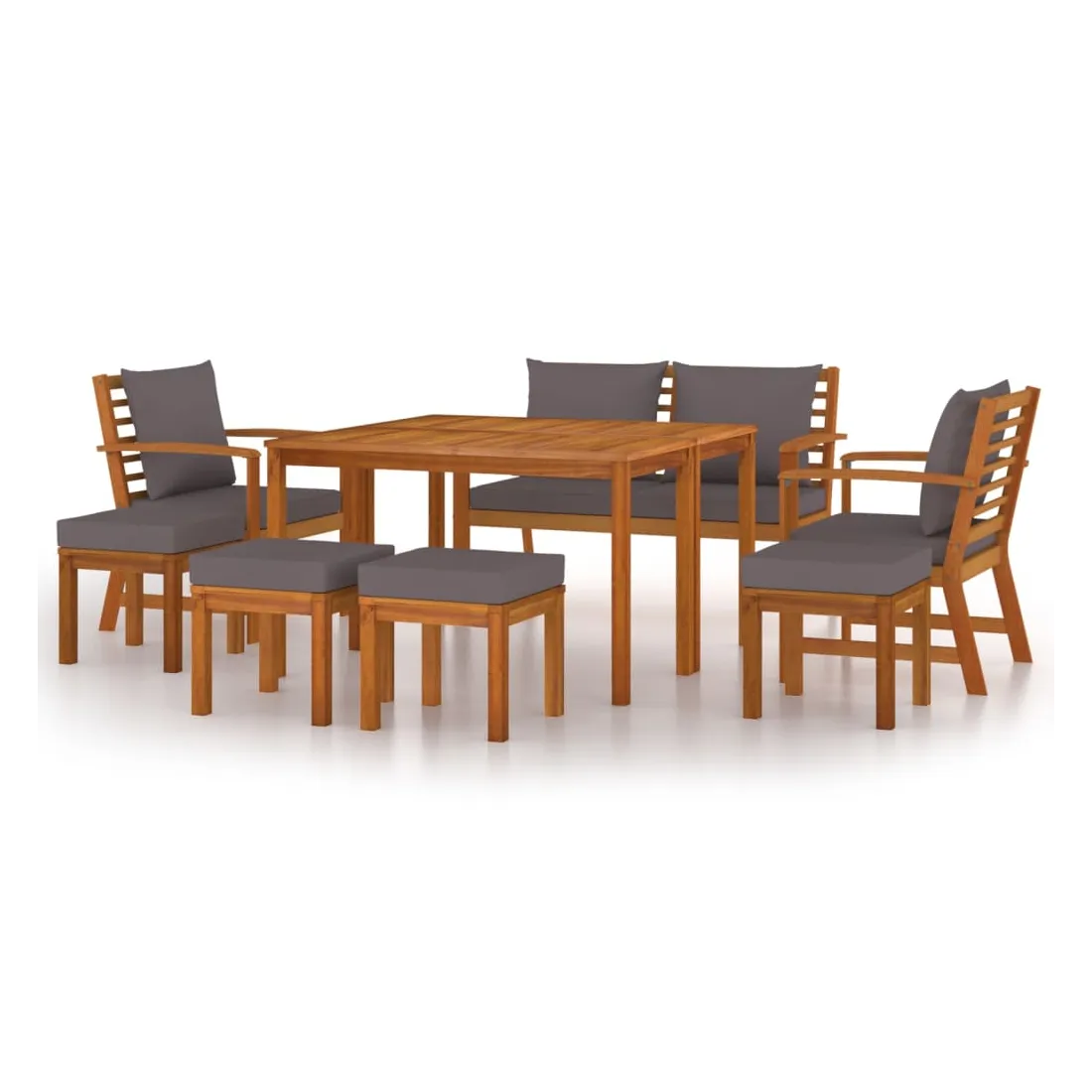 Avec son design intemporel, cet ensemble de salle à manger de jardin en bois avec coussins ajoute une touche de charme rustique à votre patio, terrasse ou jardin. Matériau durable : le bois d'acacia massif est un matériau naturel magnifique. Le bois d'acacia un bois dur tropical, qui est dense, robuste et durable.Cadre stable : le cadre en bois de l'ensemble de salle à manger garantit robustesse et stabilité.Table pratique : la table offre un espace pour les repas, les boissons et autres objets décoratifs.Conception modulaire : chaque pièce est facile à déplacer, ce qui vous permet de créer facilement différents agencements adaptés à vos besoins. Vous pouvez également trouver d'autres meubles sectionnels avec le même design et le même style dans notre boutique en ligne pour arranger vos propres modèles de meubles.Expérience de siège confortable : avec les coussins de siège et de dossier bien rembourrés, l'ensemble de salle à manger d'extérieur est très confortable. Bon à savoir :Pour faciliter au maximum le montage, chaque produit est livré avec des instructions. Remarque :Pour que vos meubles d'extérieur restent beaux, nous vous recommandons de les protéger avec une housse imperméable.La table est plus basse que les tables à manger habituelles, et elle est particulièrement adaptée pour être combinée avec des ensembles de canapés de jardin.