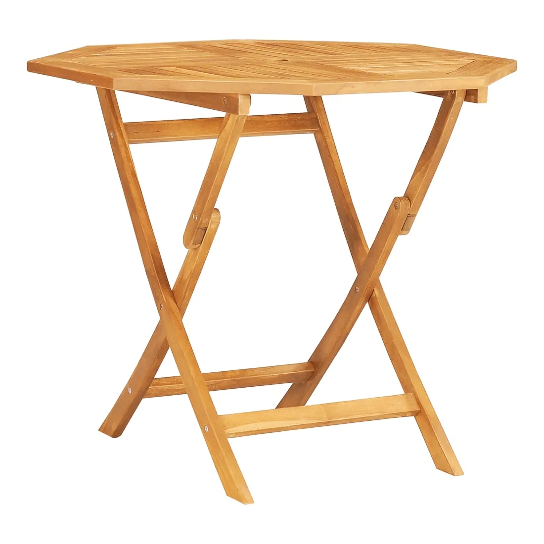 Détendez-vous et profitez d'un thé et de repas agréables avec votre famille et vos amis grâce à cet ensemble de salle à manger de jardin en bois classique ! Bois de teck massif : l'ensemble de salle à manger est fabriqué en bois de teck massif. Le bois de teck massif est un matériau naturel magnifique. Il a été chevronné, séché au four, puis sablé finement pour lui donner une apparence très lisse. Le bois de teck est connu pour sa résistance exceptionnelle et sa résistance aux intempéries.Fonction pliable : l'ensemble de salle à manger d'extérieur peut être plié pour économiser de l'espace lorsqu'il n'est pas utilisé.Expérience confortable : le dossier de la chaise de jardin vous offre un excellent soutien, offrant une expérience confortable optimale.Dessus de table robuste : le dessus de table robuste de la table à manger est parfait pour placer des repas, des boissons, des vases, des bols de fruits ou d'autres objets décoratifs.Trou pour parasol : le dessus de table est doté d'un trou pour parasol, ce qui vous permet de fixer facilement un parasol pour créer un coin ombragé.Design à lattes : la chaise à manger d'extérieur conçue avec un design à lattes est simple et intemporelle. Remarque :Pour que vos meubles d'extérieur restent beaux, nous vous recommandons de les protéger avec une housse imperméable.
