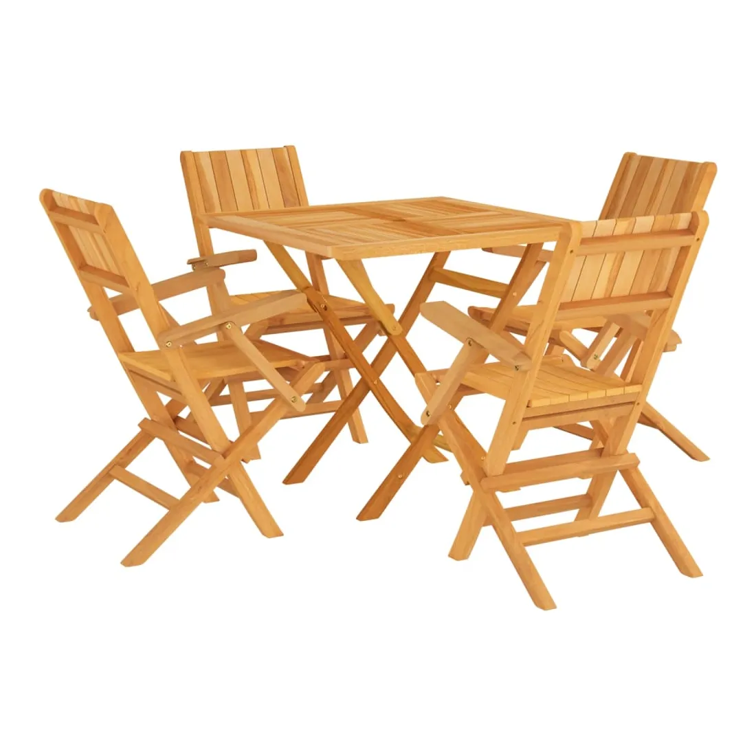 Détendez-vous et profitez d'un thé et de repas agréables avec votre famille et vos amis grâce à cet ensemble de salle à manger de jardin en bois classique ! Bois de teck massif : l'ensemble de salle à manger est fabriqué en bois de teck massif. Le bois de teck massif est un matériau naturel magnifique. Il a été chevronné, séché au four, puis sablé finement pour lui donner une apparence très lisse. Le bois de teck est connu pour sa résistance exceptionnelle et sa résistance aux intempéries.Fonction pliable : l'ensemble de salle à manger d'extérieur peut être plié pour économiser de l'espace lorsqu'il n'est pas utilisé.Expérience confortable : le dossier de la chaise de jardin vous offre un excellent soutien, offrant une expérience confortable optimale.Dessus de table robuste : le dessus de table robuste de la table à manger est parfait pour placer des repas, des boissons, des vases, des bols de fruits ou d'autres objets décoratifs.Trou pour parasol : le dessus de table est doté d'un trou pour parasol, ce qui vous permet de fixer facilement un parasol pour créer un coin ombragé.Design à lattes : la chaise à manger d'extérieur conçue avec un design à lattes est simple et intemporelle. Remarque :Pour que vos meubles d'extérieur restent beaux, nous vous recommandons de les protéger avec une housse imperméable.
