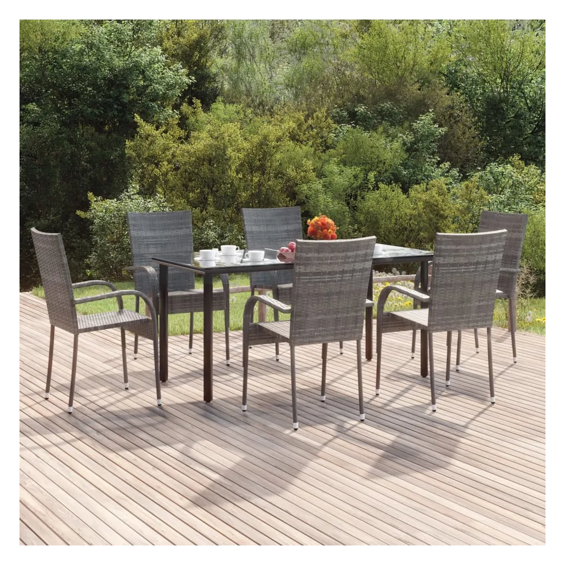 Cet ensemble de salle à manger de jardin est un excellent choix pour manger ou vous détendre dans l'espace extérieur ! Matériau durable : la résine tressée, également connue sous le nom de rotin poly, résiste aux intempéries et est facile à nettoyer. Elle reste belle à l'extérieur pendant une longue période. Elle offre une excellente qualité, commodité et un aspect esthétique.Cadre robuste : les cadres en acier enduit de poudre rendent l'ensemble de salle à manger d'extérieur robuste et stable pour une utilisation quotidienne à l'extérieur.Dessus de table pratique : le dessus lisse de la table de salle à manger est en verre trempé, facile à nettoyer avec un chiffon humide. De plus, le dessus robuste est parfait pour placer des repas, des boissons et d'autres objets décoratifs.Conception flexible : grâce à leur construction légère, ces chaises d'extérieur sont faciles à déplacer et peuvent être empilées pour économiser de l'espace lorsqu'elles ne sont pas utilisées. Remarque :Afin de prolonger la durée de vie de votre mobilier d'extérieur, nous vous recommandons de le protéger avec une housse imperméable.Chaque produit est livré avec un manuel de montage dans la boîte pour un montage facile.
