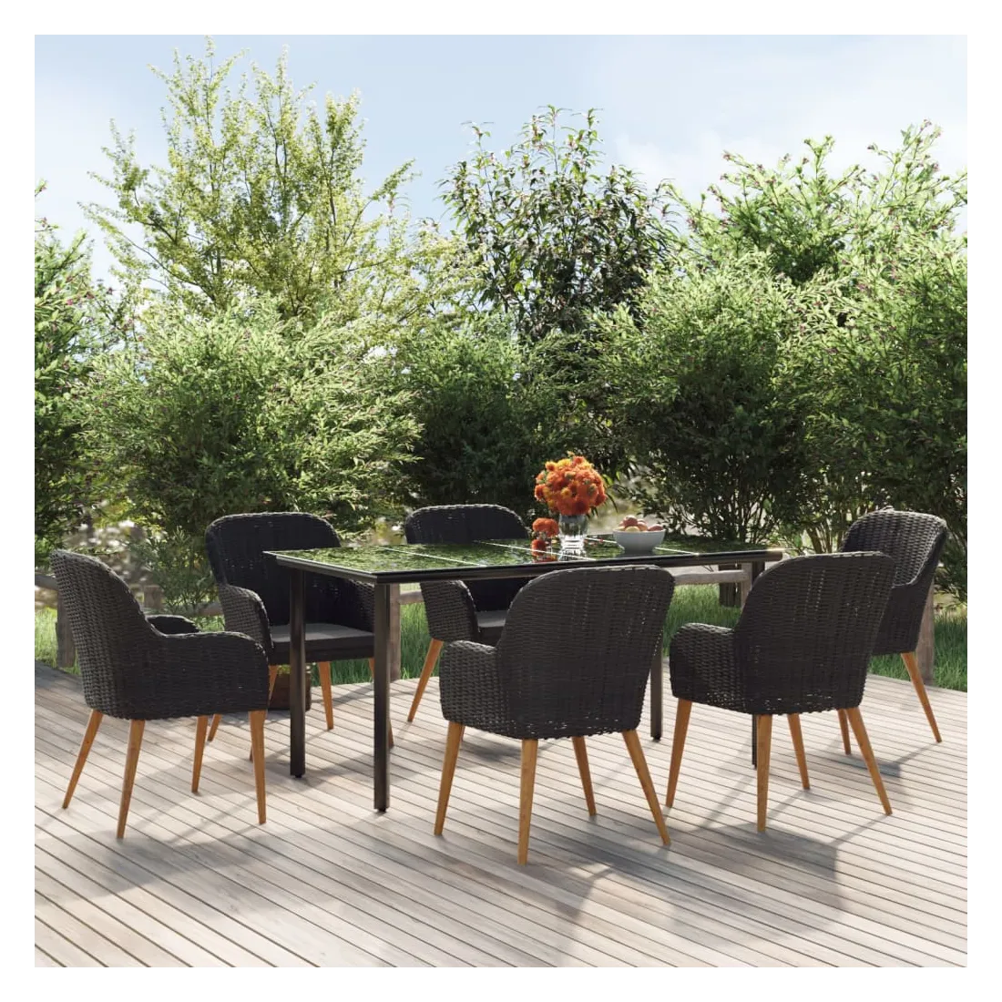 Cet élégant ensemble de salle à manger de jardin est destiné à être le point de mire de votre jardin ou patio ! C'est un excellent choix pour les repas en plein air ou pour vous détendre dans l'espace extérieur ! Bois d'acacia massif : le bois d'acacia massif est un matériau naturel magnifique. Le bois d'acacia un bois dur tropical, qui est dense, robuste et durable.Cadre robuste : les cadres en acier enduit de poudre et en bois rendent l'ensemble de salle à manger d'extérieur robuste et stable pour une utilisation quotidienne à l'extérieur.Dessus de table pratique : le dessus lisse de la table de salle à manger est en verre trempé, facile à nettoyer avec un chiffon humide. De plus, le dessus robuste est parfait pour placer des repas, des boissons et d'autres objets décoratifs.Expérience confortable : la forme ergonomique de ces chaises de salle à manger et les coussins amovibles rembourrés de mousse offrent un confort d'assise optimal. Remarque :Afin de prolonger la durée de vie de votre mobilier d'extérieur, nous vous recommandons de le protéger avec une housse imperméable.Chaque produit est livré avec un manuel de montage dans la boîte pour un montage facile.