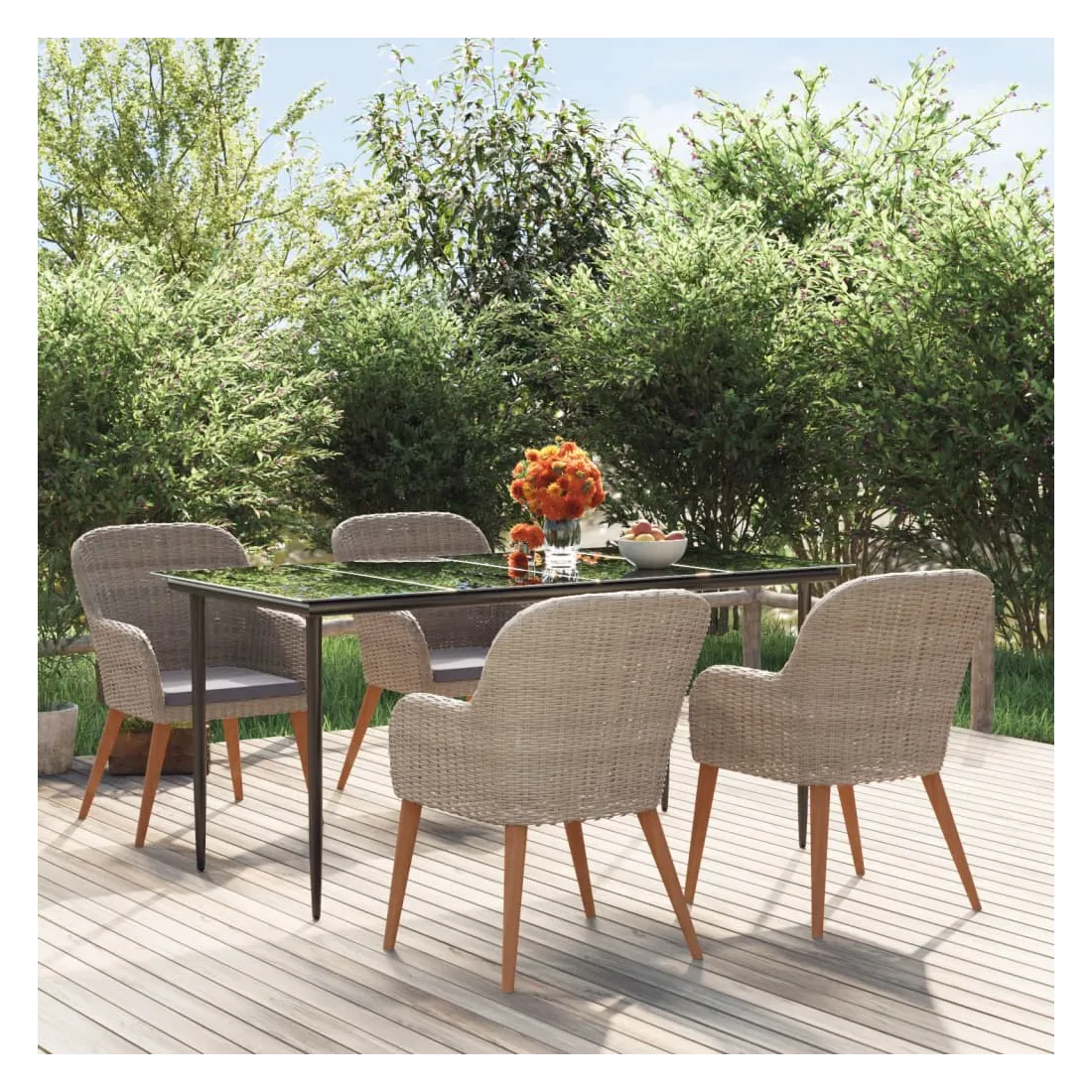 Cet élégant ensemble de salle à manger de jardin est destiné à être le point de mire de votre jardin ou patio ! C'est un excellent choix pour les repas en plein air ou pour vous détendre dans l'espace extérieur ! Bois d'acacia massif : le bois d'acacia massif est un matériau naturel magnifique. Le bois d'acacia un bois dur tropical, qui est dense, robuste et durable.Cadre robuste : les cadres en acier enduit de poudre et en bois rendent l'ensemble de salle à manger d'extérieur robuste et stable pour une utilisation quotidienne à l'extérieur.Dessus de table pratique : le dessus lisse de la table de salle à manger est en verre trempé, facile à nettoyer avec un chiffon humide. De plus, le dessus robuste est parfait pour placer des repas, des boissons et d'autres objets décoratifs.Expérience confortable : la forme ergonomique de ces chaises de salle à manger et les coussins amovibles rembourrés de mousse offrent un confort d'assise optimal. Remarque :Afin de prolonger la durée de vie de votre mobilier d'extérieur, nous vous recommandons de le protéger avec une housse imperméable.Chaque produit est livré avec un manuel de montage dans la boîte pour un montage facile.