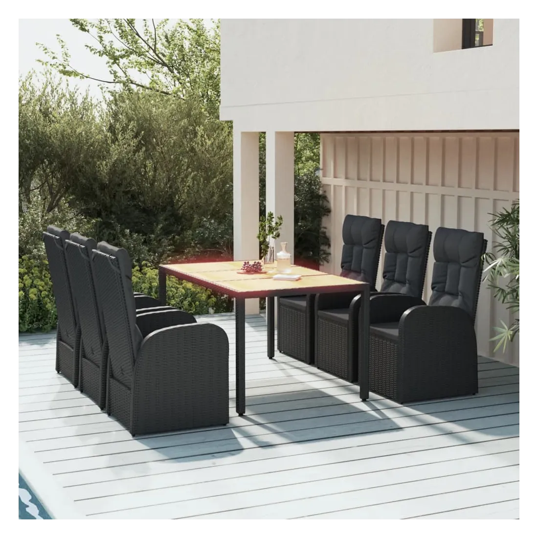 Cet ensemble de salle à manger de jardin tendance, au design élégant et contemporain, est un excellent choix pour manger ou vous détendre dans votre jardin. Matériau résistant aux intempéries : la résine tressée, également connue sous le nom de rotin poly, résiste aux intempéries et est facile à nettoyer. Elle reste belle à l'extérieur pendant une longue période. Elle offre une excellente qualité, commodité et un aspect esthétique.Cadre robuste : les cadres en acier enduit de poudre rendent l'ensemble de salle à manger d'extérieur robuste et stable pour une utilisation quotidienne à l'extérieur.Dessus de table pratique : le dessus de table robuste est parfait pour placer des repas, des boissons et d'autres objets décoratifs.Conception modulaire : l'ensemble de salle à manger de jardin est flexible et facile à déplacer, vous pouvez donc le combiner avec d'autres segments modulaires dans la boutique en ligne pour créer vos propres configurations d'ensemble de salle à manger de jardin !Fonction d'inclinaison : les chaises de jardin sont spécialement conçues avec une fonction d'inclinaison afin que vous puissiez régler le dossier selon votre confort.Expérience d'assise confortable : le dossier ajoute un confort d'assise supplémentaire à la chaise de jardin. De plus, les coussins bien rembourrés vous permettent de vous asseoir confortablement. Bon à savoir :Pour faciliter au maximum le montage, chaque produit est livré avec des instructions. Remarque :Pour que vos meubles d'extérieur restent beaux, nous vous recommandons de les protéger avec une housse imperméable.