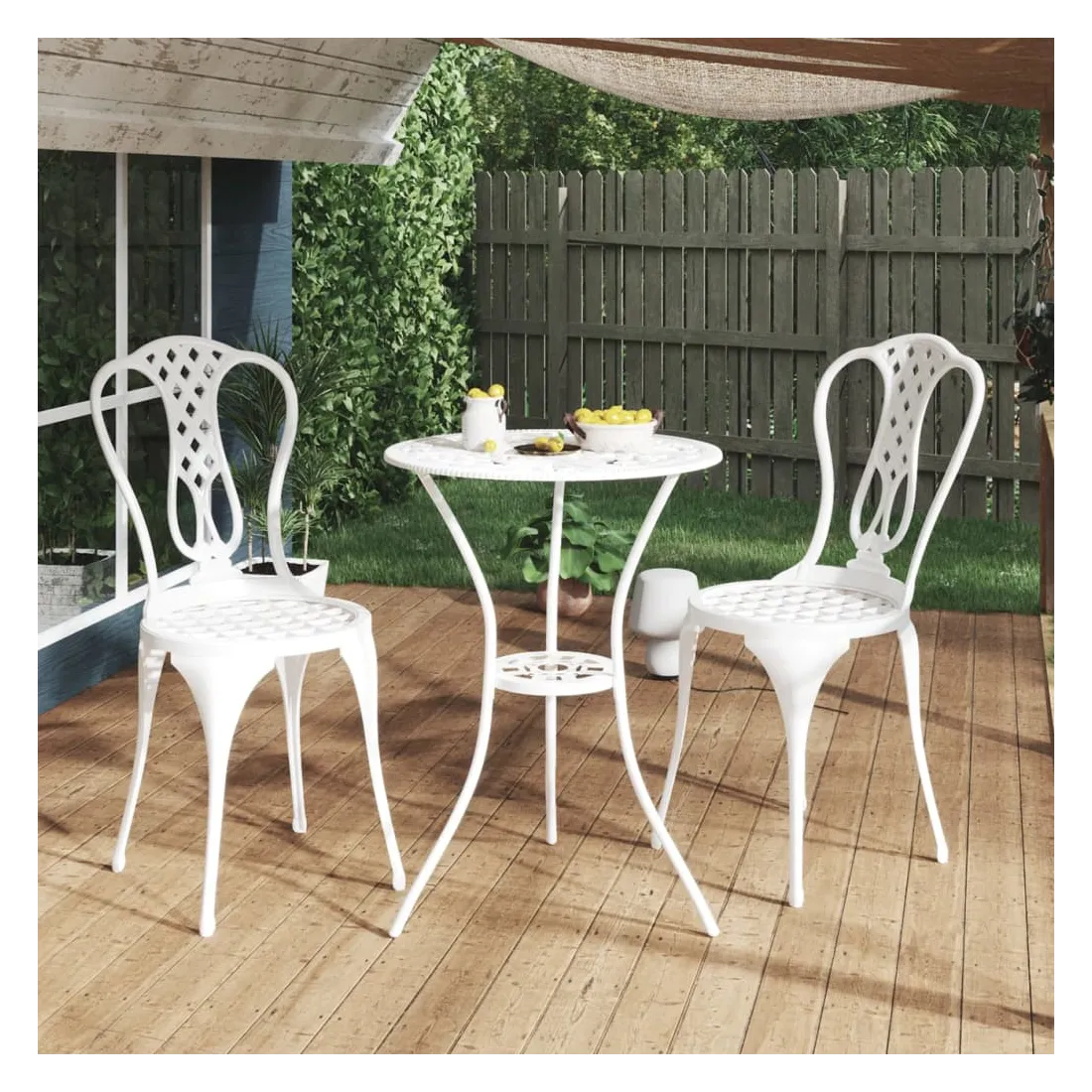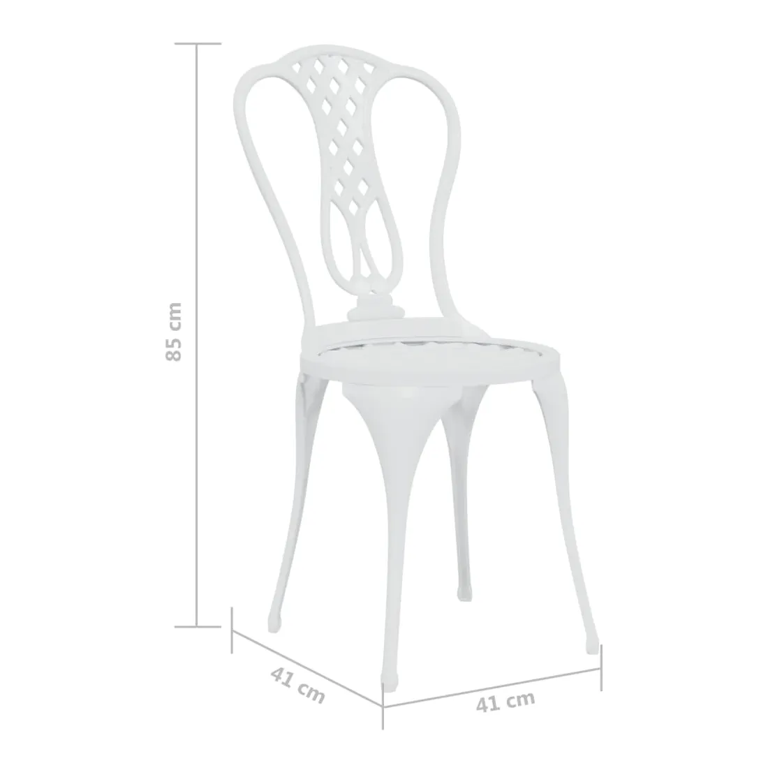 Cet ensemble de bistro ajoutera une touche de luxe à n'importe quel dîner. Vous fera beaucoup de plaisir de bavarder avec vos amis ou de prendre une tasse de thé tout en vous détendant sur cet ensemble de mobilier de jardin décoratif mais fonctionnel. L'ensemble de bistro de terrasse est fabriqué en aluminium coulé, qui est résistant aux intempéries et très durable. Le motif floral détaillé donnera à n'importe quel jardin, patio ou véranda une touche romantique. Remarque : afin de prolonger la durée de vie des meubles d'extérieur, nous vous recommandons de les protéger avec une housse imperméable.