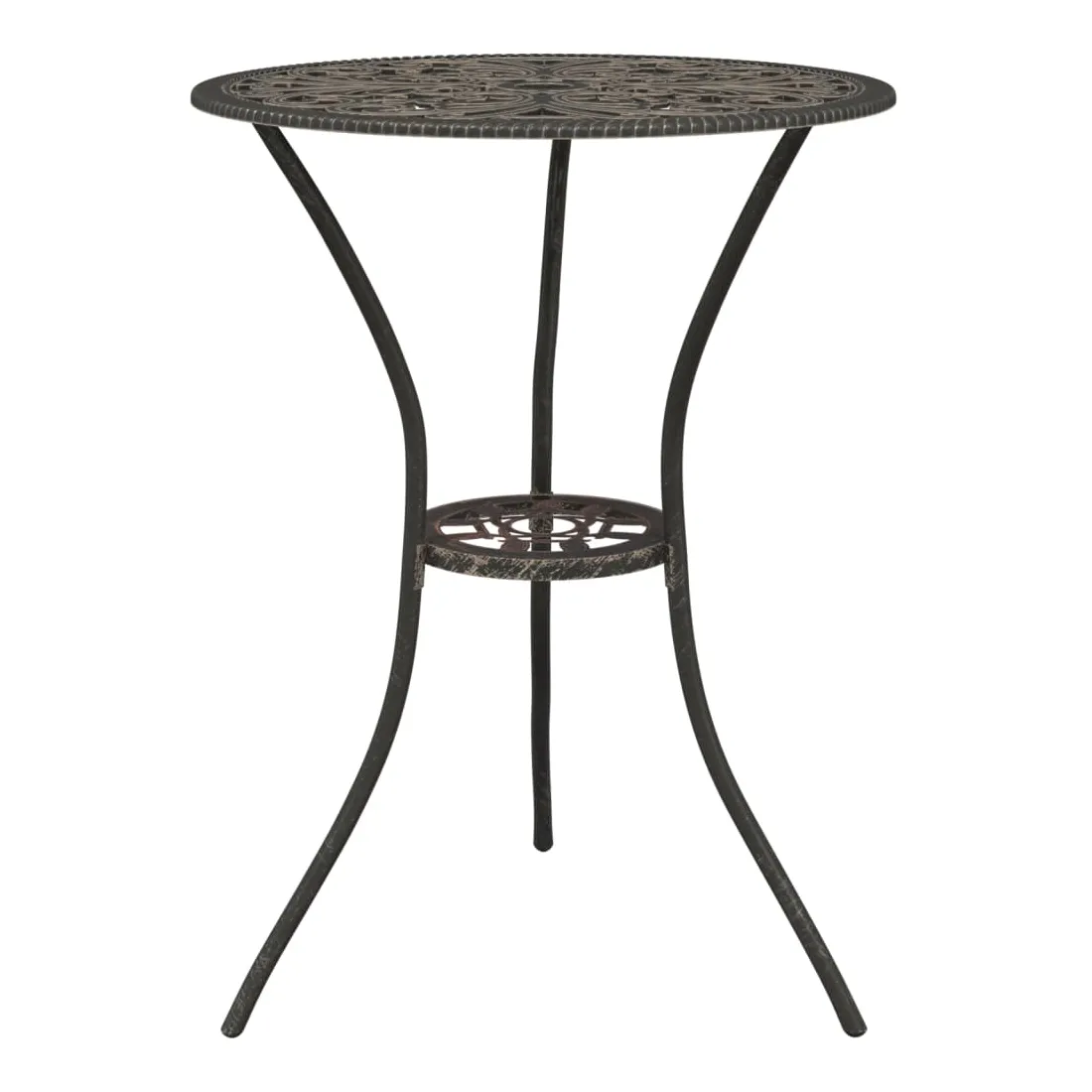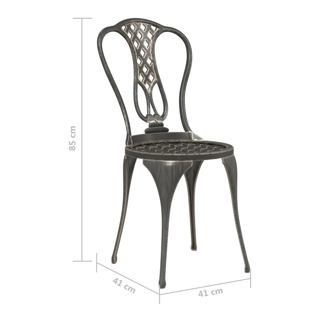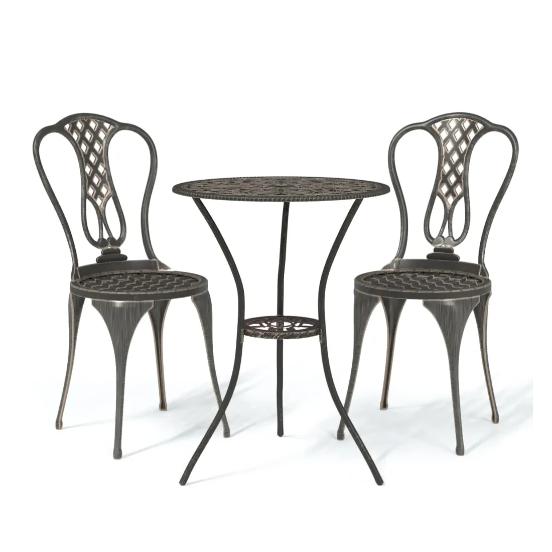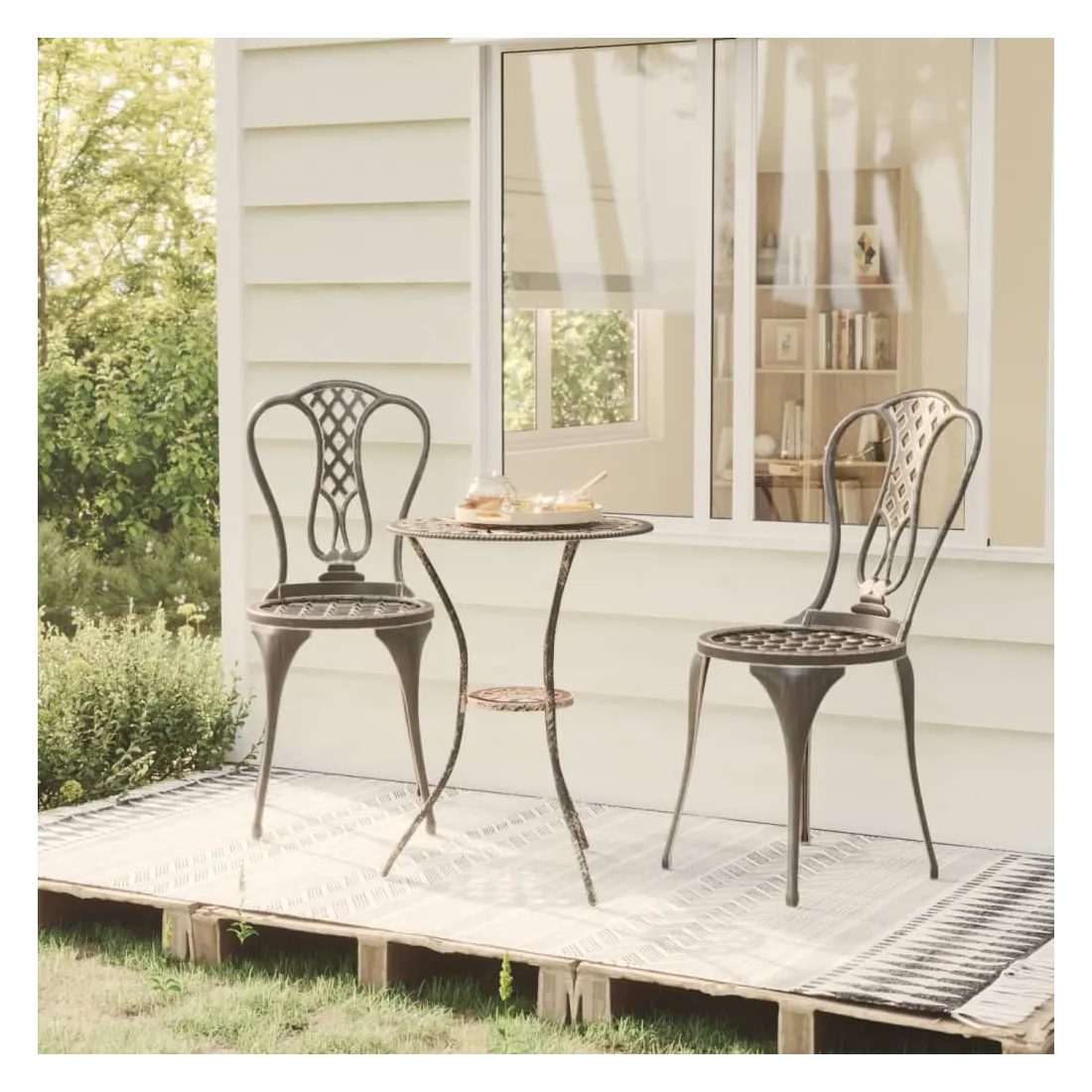 Cet ensemble de bistro ajoutera une touche de luxe à n'importe quel dîner. Vous fera beaucoup de plaisir de bavarder avec vos amis ou de prendre une tasse de thé tout en vous détendant sur cet ensemble de mobilier de jardin décoratif mais fonctionnel. L'ensemble de bistro de terrasse est fabriqué en aluminium coulé, qui est résistant aux intempéries et très durable. Le motif floral détaillé donnera à n'importe quel jardin, patio ou véranda une touche romantique. Remarque : afin de prolonger la durée de vie des meubles d'extérieur, nous vous recommandons de les protéger avec une housse imperméable.