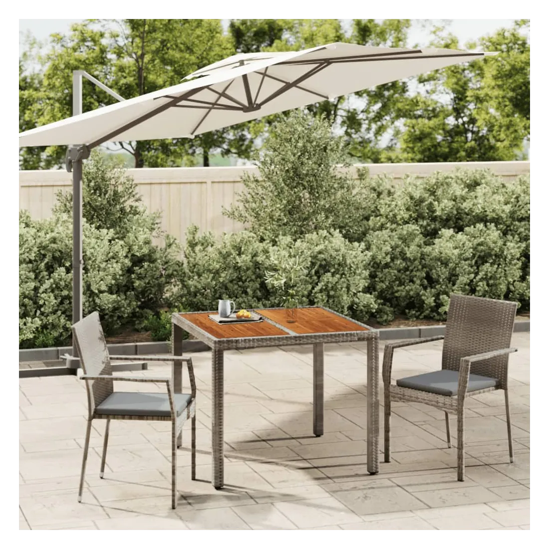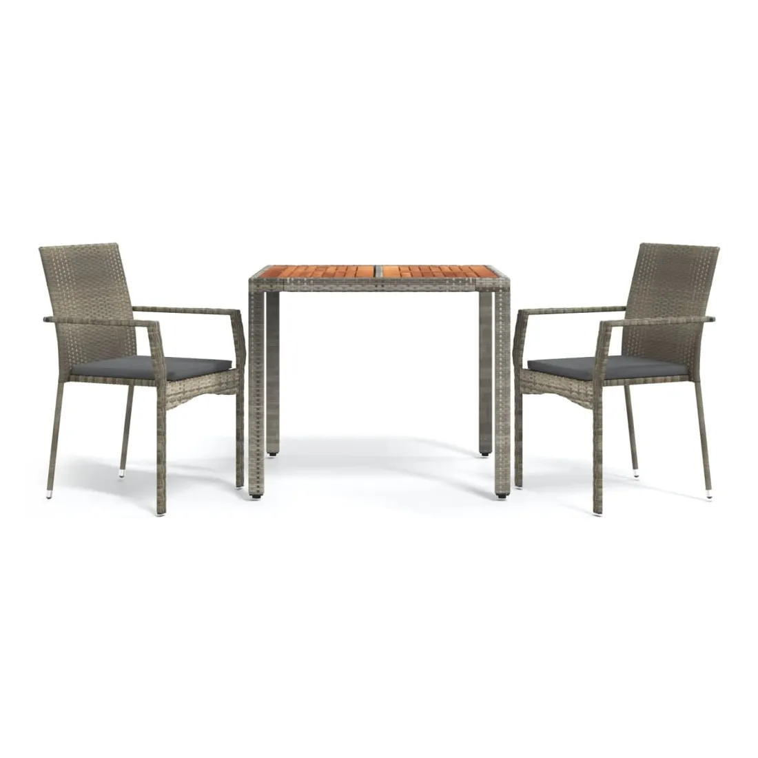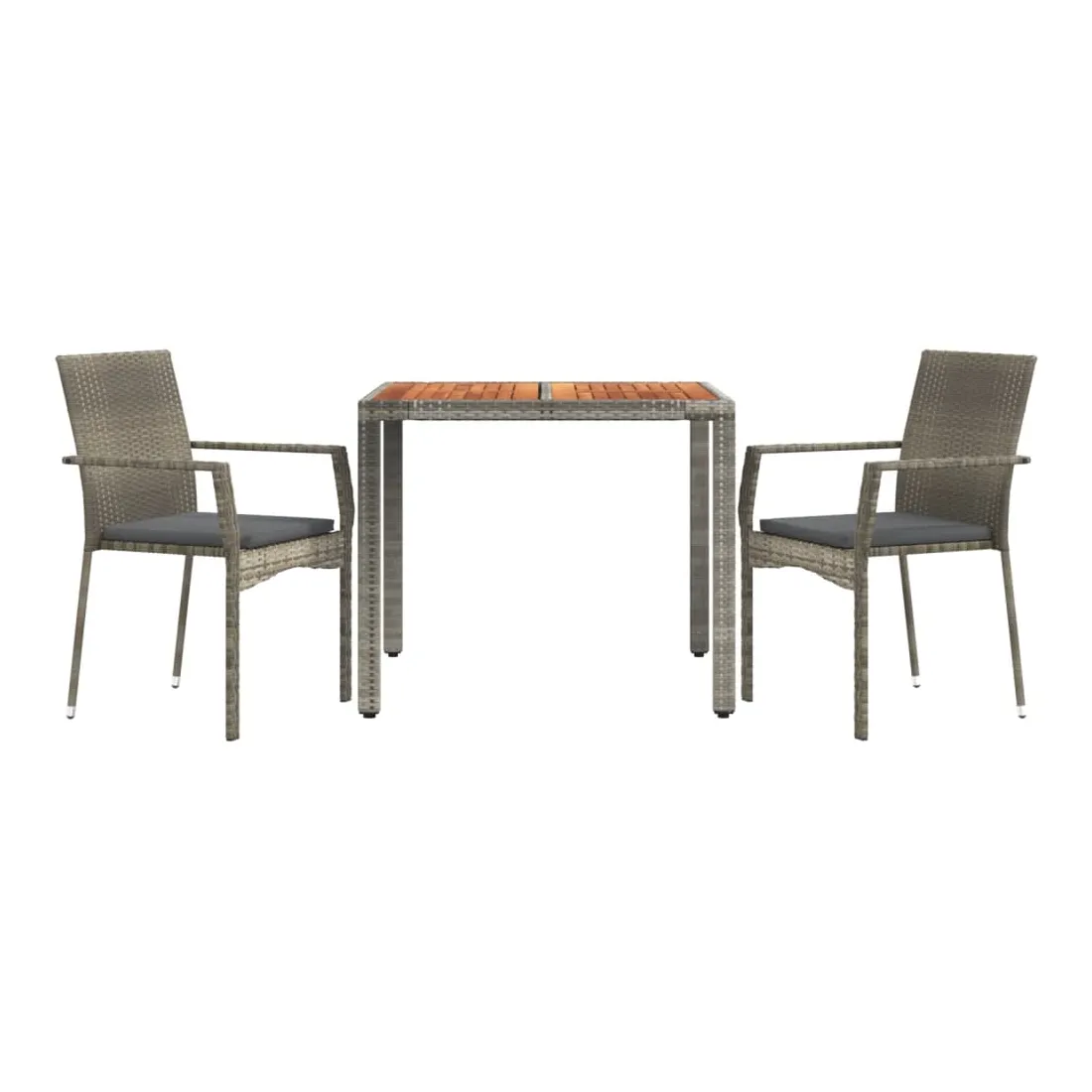 vidaXLCet ensemble de salle à manger de jardin tendance, au design élégant et contemporain, est un excellent choix pour manger ou vous détendre dans votre jardin. Matériau résistant aux intempéries : la résine tressée, également connue sous le nom de rotin poly, résiste aux intempéries et est facile à nettoyer. Elle reste belle à l'extérieur pendant une longue période. Elle offre une excellente qualité, commodité et un aspect esthétique.Cadre robuste : les cadres en acier enduit de poudre rendent l'ensemble de salle à manger d'extérieur robuste et stable pour une utilisation quotidienne à l'extérieur.Dessus de table pratique : le dessus de table en bois d'acacia massif est parfait pour placer des boissons, des aliments et des décorations. Il a une belle apparence et est facile à nettoyer.Conception modulaire : l'ensemble de salle à manger de jardin est flexible et facile à déplacer, vous pouvez donc le combiner avec d'autres segments modulaires dans la boutique en ligne pour créer vos propres configurations d'ensemble de salle à manger de jardin !Expérience d'assise confortable : le dossier ajoute un confort d'assise supplémentaire à la chaise de jardin. De plus, les coussins bien rembourrés vous permettent de vous asseoir confortablement. Bon à savoir :Pour faciliter au maximum le montage, chaque produit est livré avec des instructions. Remarque :Pour que vos meubles d'extérieur restent beaux, nous vous recommandons de les protéger avec une housse imperméable.