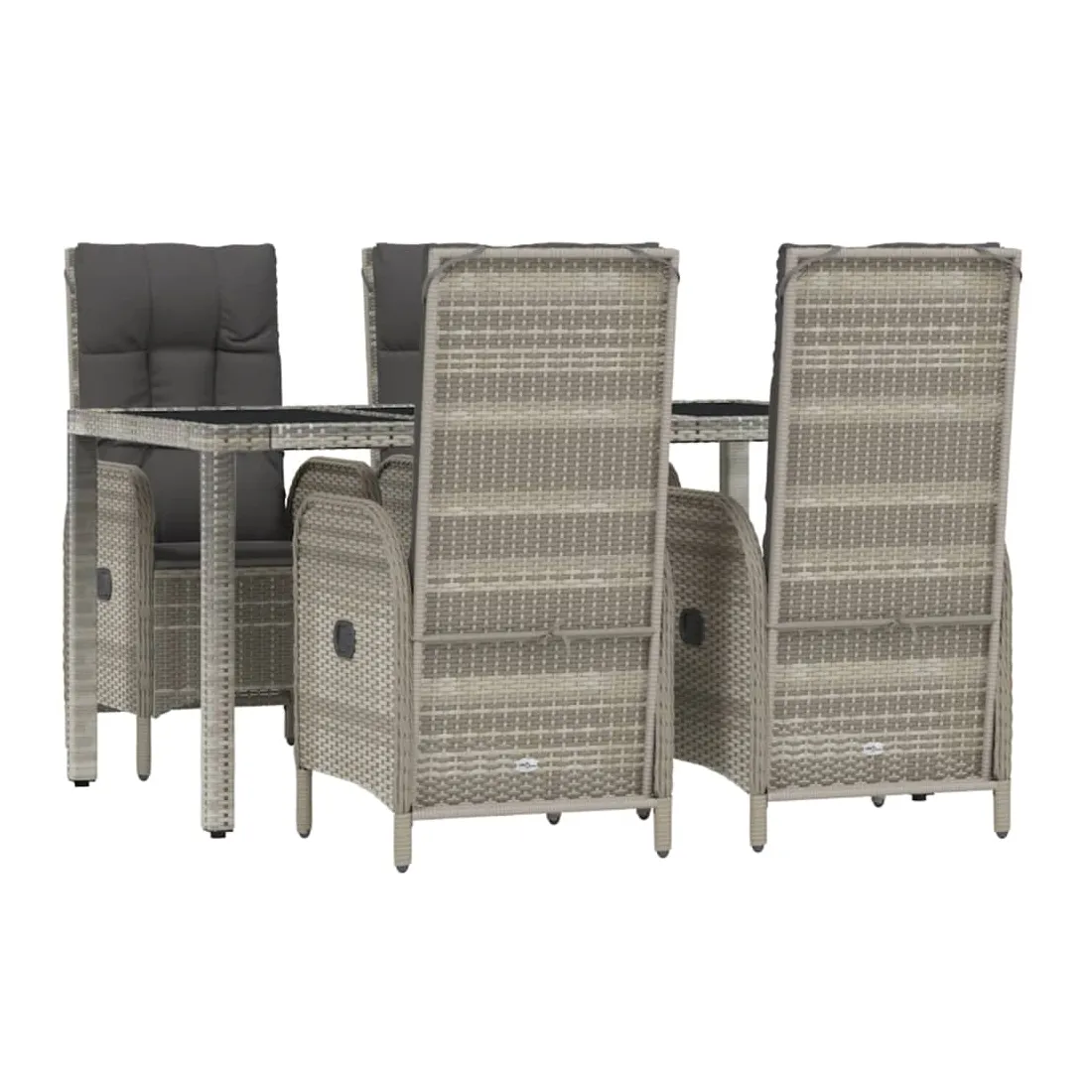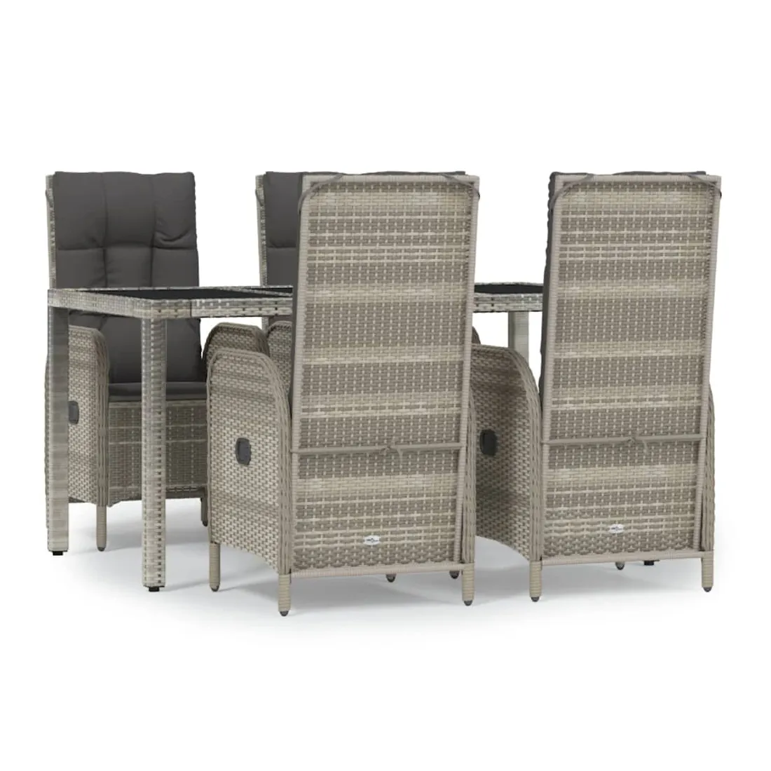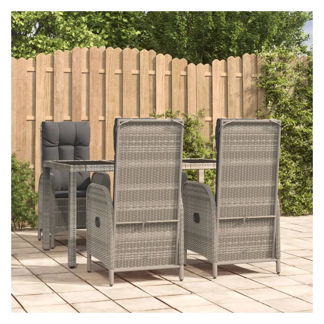 Cet ensemble de salle à manger de jardin tendance, au design élégant et contemporain, est un excellent choix pour manger ou vous détendre dans votre jardin. Matériau résistant aux intempéries : la résine tressée, également connue sous le nom de rotin poly, résiste aux intempéries et est facile à nettoyer. Elle reste belle à l'extérieur pendant une longue période. Elle offre une excellente qualité, commodité et un aspect esthétique.Cadre robuste : les cadres en acier enduit de poudre rendent l'ensemble de salle à manger d'extérieur robuste et stable pour une utilisation quotidienne à l'extérieur.Dessus de table pratique : le dessus lisse de la table de jardin est en verre trempé, facile à nettoyer avec un chiffon humide. De plus, le dessus robuste est parfait pour placer des repas, des boissons et d'autres objets décoratifs.Fonction d'inclinaison : les chaises de jardin sont spécialement conçues avec une fonction d'inclinaison afin que vous puissiez régler le dossier selon votre confort.Expérience d'assise confortable : le dossier ajoute un confort d'assise supplémentaire à la chaise de jardin. De plus, les coussins bien rembourrés vous permettent de vous asseoir confortablement. Bon à savoir :Pour faciliter au maximum le montage, chaque produit est livré avec des instructions. Remarque :Pour que vos meubles d'extérieur restent beaux, nous vous recommandons de les protéger avec une housse imperméable.