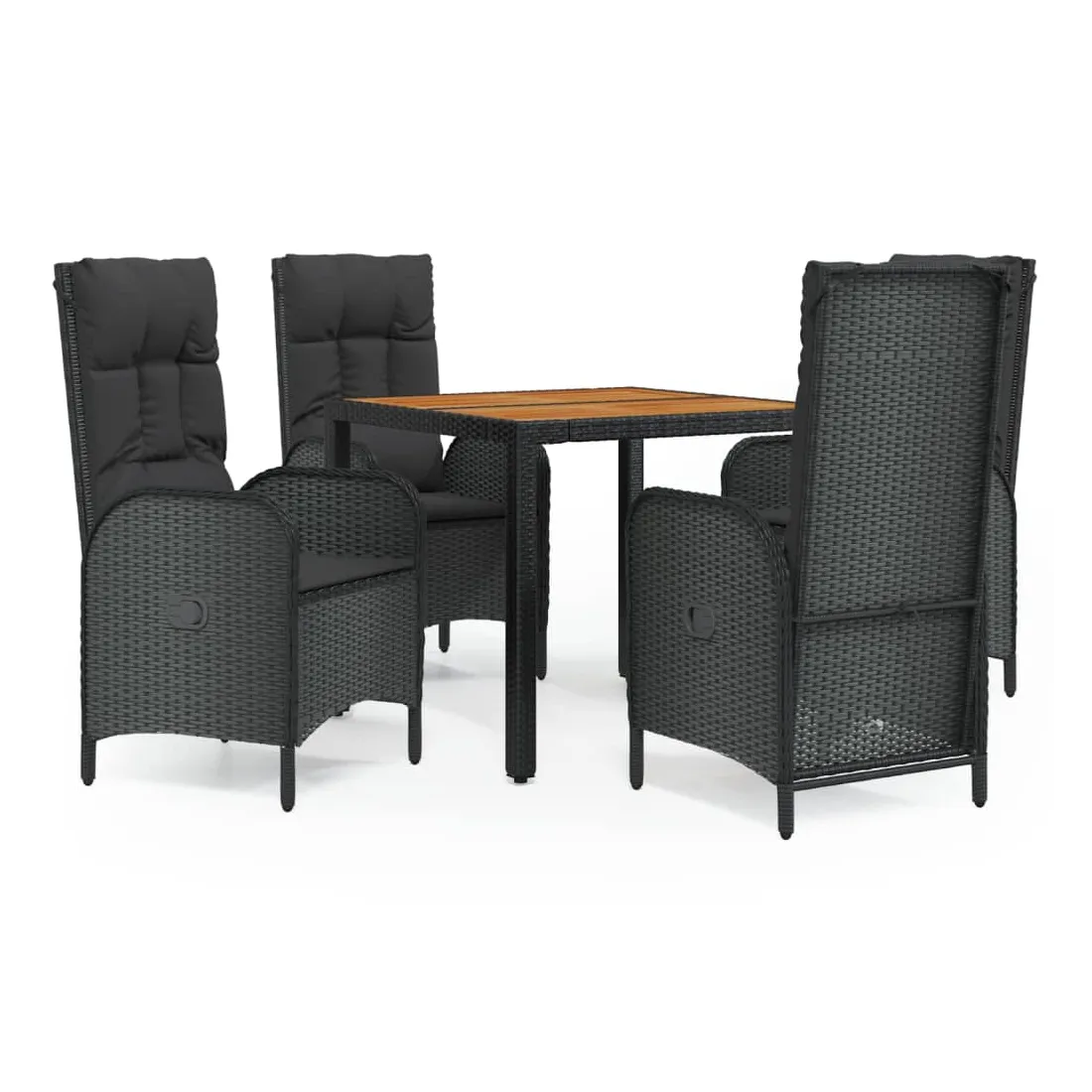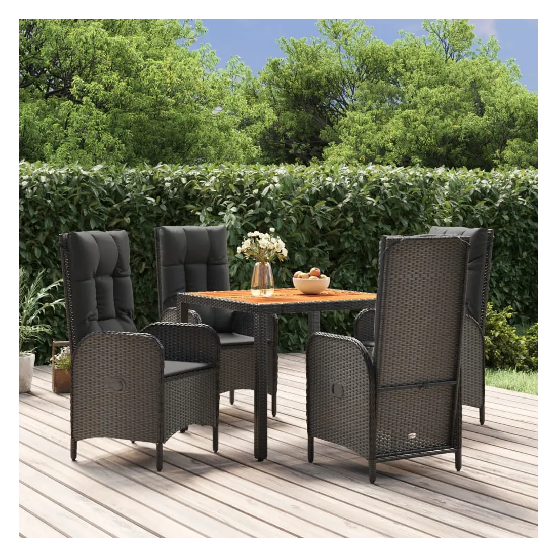 Cet ensemble de salle à manger de jardin tendance, au design élégant et contemporain, est un excellent choix pour manger ou vous détendre dans votre jardin. Matériau résistant aux intempéries : la résine tressée, également connue sous le nom de rotin poly, résiste aux intempéries et est facile à nettoyer. Elle reste belle à l'extérieur pendant une longue période. Elle offre une excellente qualité, commodité et un aspect esthétique.Cadre robuste : les cadres en acier enduit de poudre rendent l'ensemble de salle à manger d'extérieur robuste et stable pour une utilisation quotidienne à l'extérieur.Dessus de table pratique : le dessus de table en bois d'acacia massif est parfait pour placer des boissons, des aliments et des décorations. Il a une belle apparence et est facile à nettoyer.Fonction d'inclinaison : les chaises de jardin sont spécialement conçues avec une fonction d'inclinaison afin que vous puissiez régler le dossier selon votre confort.Expérience d'assise confortable : le dossier ajoute un confort d'assise supplémentaire à la chaise de jardin. De plus, les coussins bien rembourrés vous permettent de vous asseoir confortablement. Bon à savoir :Pour faciliter au maximum le montage, chaque produit est livré avec des instructions. Remarque :Pour que vos meubles d'extérieur restent beaux, nous vous recommandons de les protéger avec une housse imperméable.