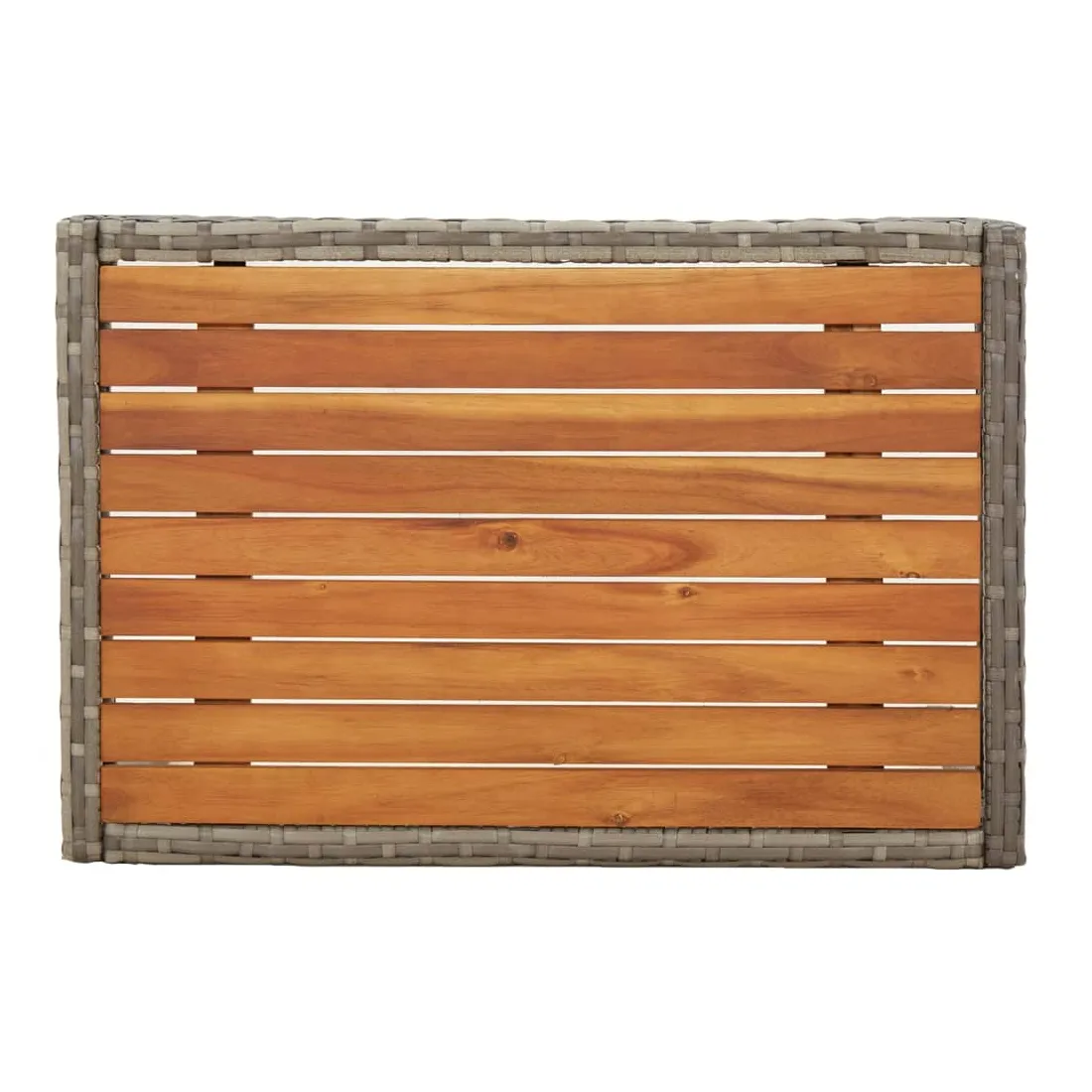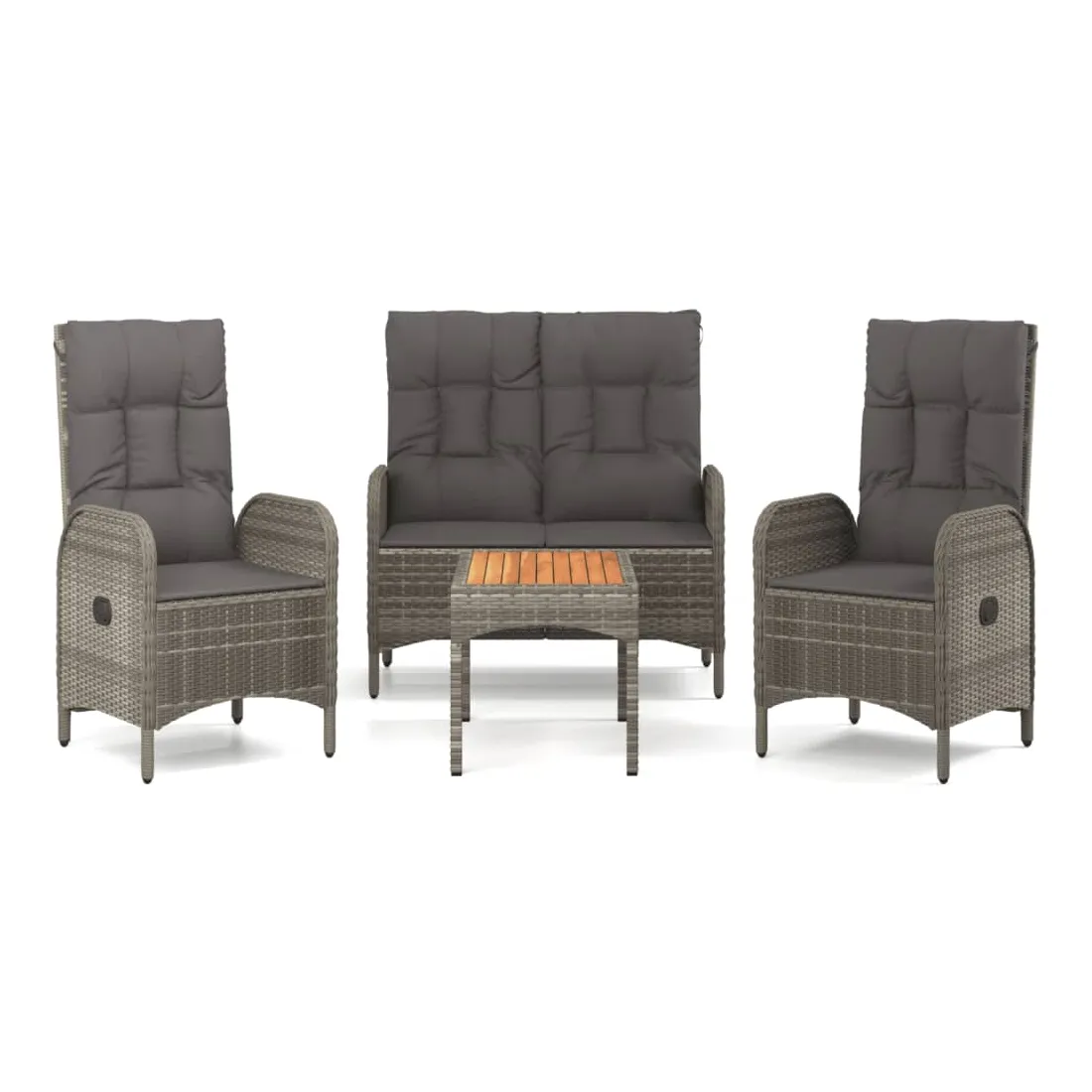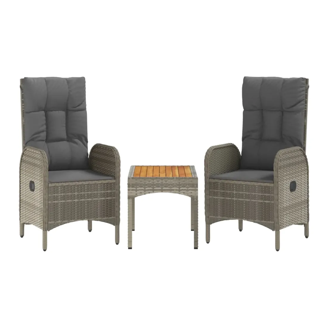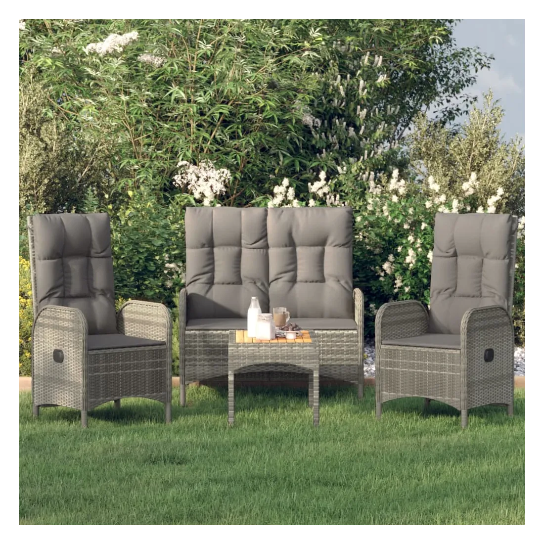 Cet ensemble de salon de jardin tendance, au design élégant et contemporain, est un excellent choix pour manger ou vous détendre dans votre jardin. Matériau résistant aux intempéries : la résine tressée, également connue sous le nom de rotin poly, résiste aux intempéries et est facile à nettoyer. Elle reste belle à l'extérieur pendant une longue période. Elle offre une excellente qualité, commodité et un aspect esthétique.Cadre robuste : les cadres en acier enduit de poudre rendent l'ensemble de salon d'extérieur robuste et stable pour une utilisation quotidienne à l'extérieur.Dessus de table pratique : le dessus de table en bois d'acacia massif est parfait pour placer des boissons, des aliments et des décorations. Il a une belle apparence et est facile à nettoyer.Fonction d'inclinaison : les chaises de jardin sont spécialement conçues avec une fonction d'inclinaison afin que vous puissiez régler le dossier selon votre confort.Expérience d'assise confortable : le dossier ajoute un confort d'assise supplémentaire à la chaise de jardin. De plus, les coussins bien rembourrés vous permettent de vous asseoir confortablement. Bon à savoir :Pour faciliter au maximum le montage, chaque produit est livré avec des instructions. Remarque :Pour que vos meubles d'extérieur restent beaux, nous vous recommandons de les protéger avec une housse imperméable.