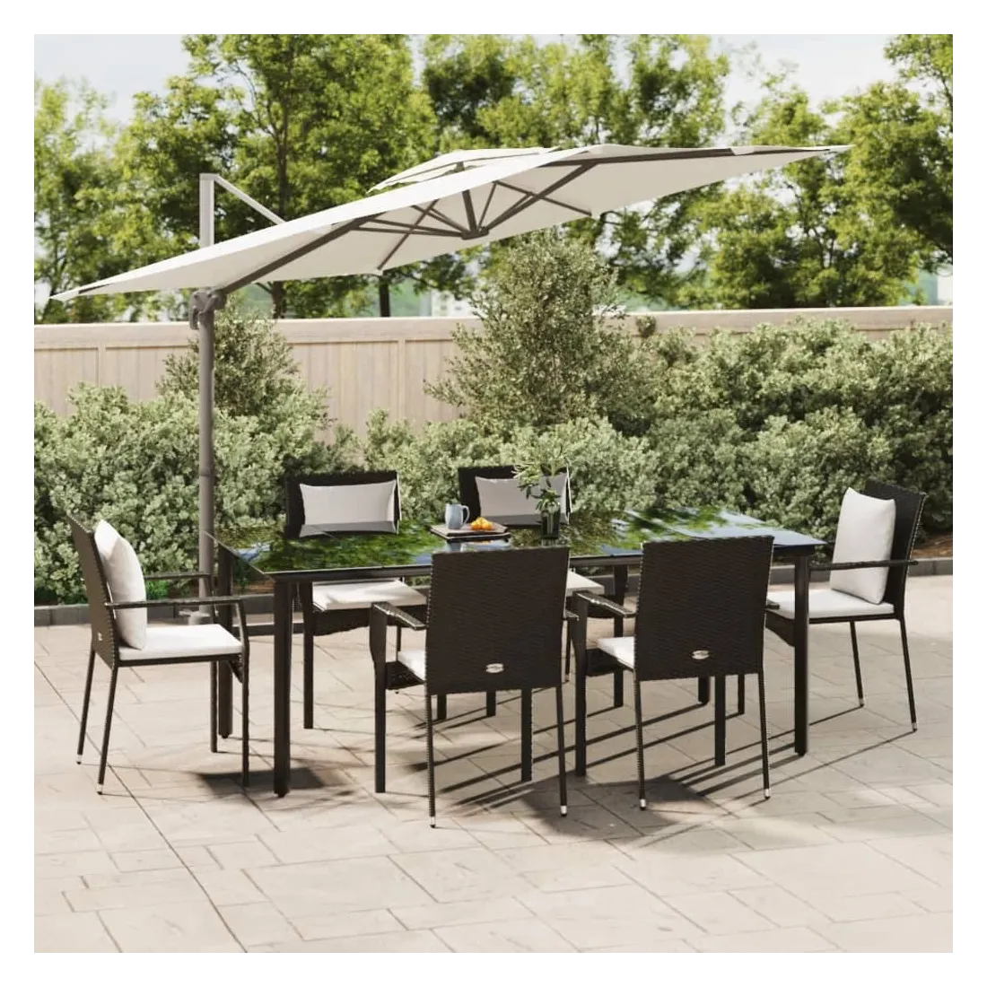 Cet ensemble de salle à manger de jardin tendance, au design élégant et contemporain, est un excellent choix pour manger ou vous détendre dans votre jardin. Matériau résistant aux intempéries : la résine tressée, également connue sous le nom de rotin poly, résiste aux intempéries et est facile à nettoyer. Elle reste belle à l'extérieur pendant une longue période. Elle offre une excellente qualité, commodité et un aspect esthétique.Cadre robuste : les cadres en acier enduit de poudre rendent l'ensemble de salle à manger d'extérieur robuste et stable pour une utilisation quotidienne à l'extérieur.Dessus de table pratique : le dessus lisse de la table de jardin est en verre trempé, facile à nettoyer avec un chiffon humide. De plus, le dessus robuste est parfait pour placer des repas, des boissons et d'autres objets décoratifs.Conception modulaire : l'ensemble de salle à manger de jardin est flexible et facile à déplacer, vous pouvez donc le combiner avec d'autres segments modulaires dans la boutique en ligne pour créer vos propres configurations d'ensemble de salle à manger de jardin !Expérience d'assise confortable : le dossier ajoute un confort d'assise supplémentaire à la chaise de jardin. De plus, les coussins bien rembourrés vous permettent de vous asseoir confortablement. Bon à savoir :Pour faciliter au maximum le montage, chaque produit est livré avec des instructions. Remarque :Pour que vos meubles d'extérieur restent beaux, nous vous recommandons de les protéger avec une housse imperméable.