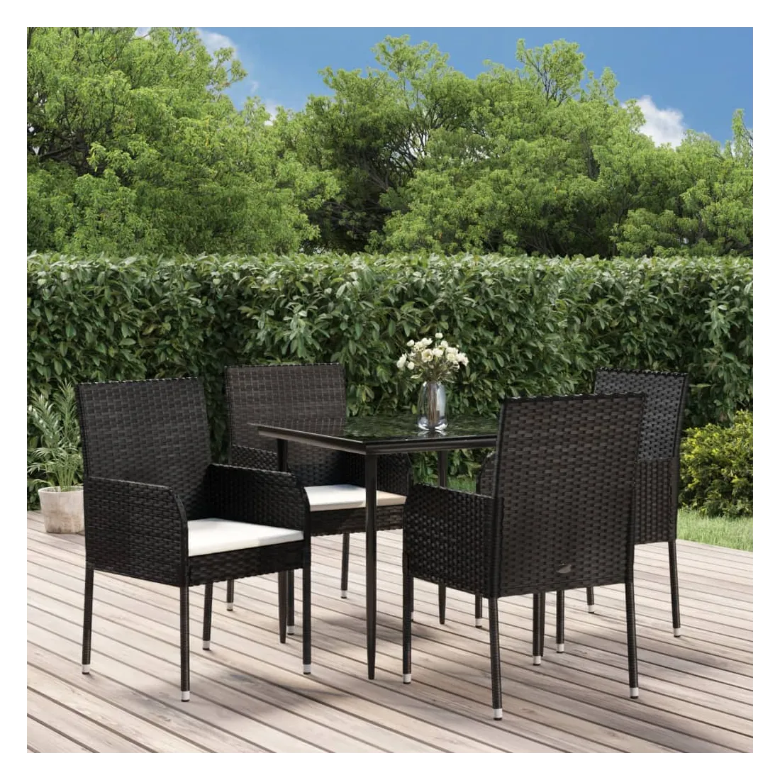 Cet ensemble de salle à manger de jardin tendance, au design élégant et contemporain, est un excellent choix pour manger ou vous détendre dans votre jardin. Matériau résistant aux intempéries : la résine tressée, également connue sous le nom de rotin poly, résiste aux intempéries et est facile à nettoyer. Elle reste belle à l'extérieur pendant une longue période. Elle offre une excellente qualité, commodité et un aspect esthétique.Cadre robuste : les cadres en acier enduit de poudre rendent l'ensemble de salle à manger d'extérieur robuste et stable pour une utilisation quotidienne à l'extérieur.Dessus de table pratique : le dessus lisse de la table de jardin est en verre trempé, facile à nettoyer avec un chiffon humide. De plus, le dessus robuste est parfait pour placer des repas, des boissons et d'autres objets décoratifs.Conception modulaire : l'ensemble de salle à manger de jardin est flexible et facile à déplacer, vous pouvez donc le combiner avec d'autres segments modulaires dans la boutique en ligne pour créer vos propres configurations d'ensemble de salle à manger de jardin !Expérience d'assise confortable : le dossier ajoute un confort d'assise supplémentaire à la chaise de jardin. De plus, les coussins bien rembourrés vous permettent de vous asseoir confortablement. Bon à savoir :Pour faciliter au maximum le montage, chaque produit est livré avec des instructions. Remarque :Pour que vos meubles d'extérieur restent beaux, nous vous recommandons de les protéger avec une housse imperméable.
