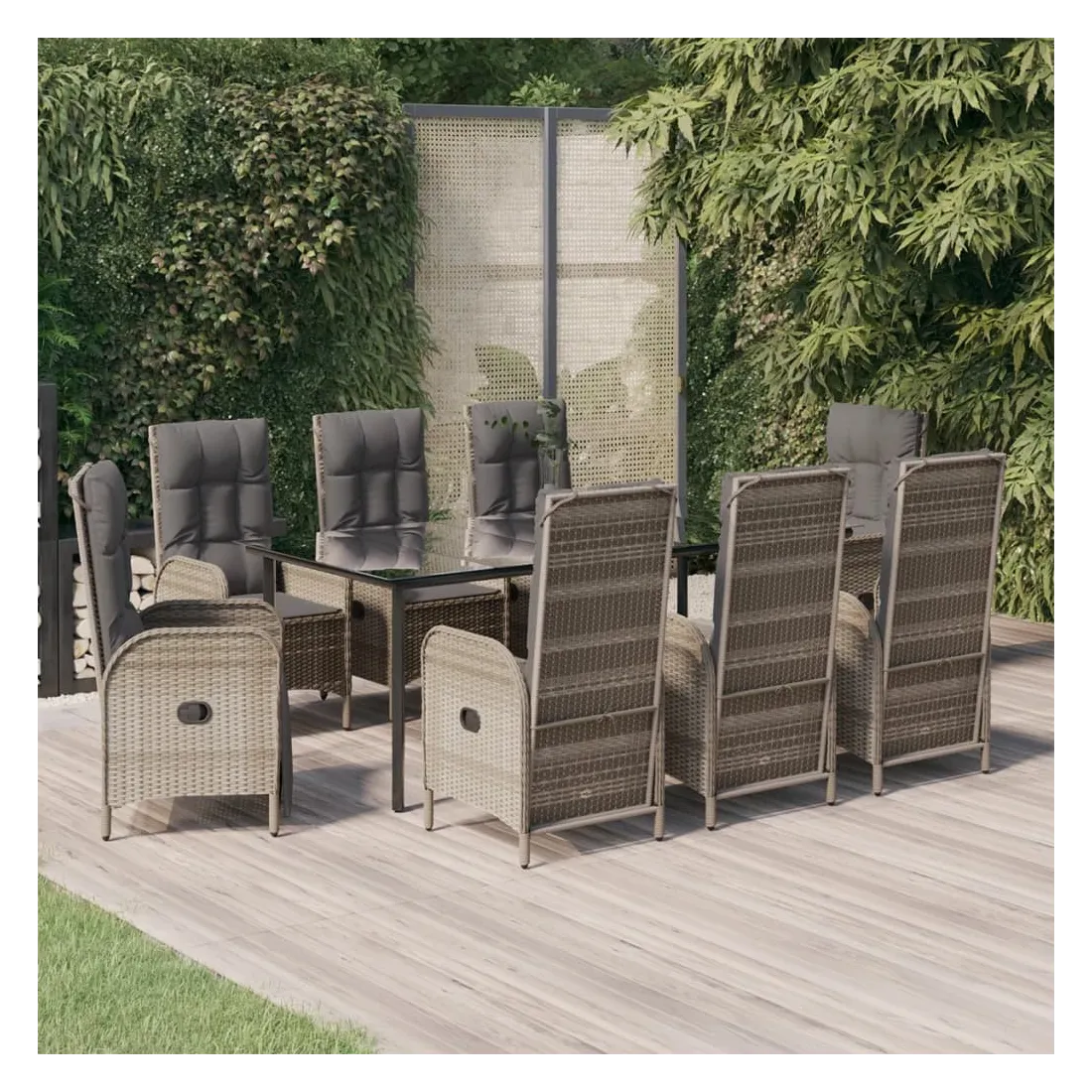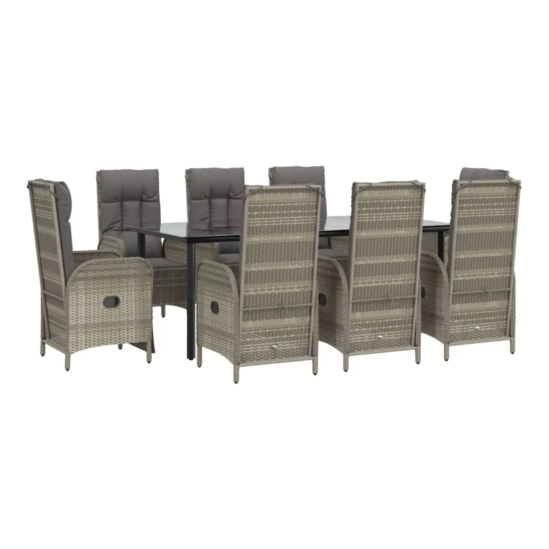 Cet ensemble de salle à manger de jardin tendance, au design élégant et contemporain, est un excellent choix pour manger ou vous détendre dans votre jardin. Matériau résistant aux intempéries : la résine tressée, également connue sous le nom de rotin poly, résiste aux intempéries et est facile à nettoyer. Elle reste belle à l'extérieur pendant une longue période. Elle offre une excellente qualité, commodité et un aspect esthétique.Cadre robuste : les cadres en acier enduit de poudre rendent l'ensemble de salle à manger d'extérieur robuste et stable pour une utilisation quotidienne à l'extérieur.Dessus de table pratique : le dessus lisse de la table de jardin est en verre trempé, facile à nettoyer avec un chiffon humide. De plus, le dessus robuste est parfait pour placer des repas, des boissons et d'autres objets décoratifs.Fonction d'inclinaison : les chaises de jardin sont spécialement conçues avec une fonction d'inclinaison afin que vous puissiez régler le dossier selon votre confort.Expérience d'assise confortable : le dossier ajoute un confort d'assise supplémentaire à la chaise de jardin. De plus, les coussins bien rembourrés vous permettent de vous asseoir confortablement. Bon à savoir :Pour faciliter au maximum le montage, chaque produit est livré avec des instructions. Remarque :Pour que vos meubles d'extérieur restent beaux, nous vous recommandons de les protéger avec une housse imperméable.