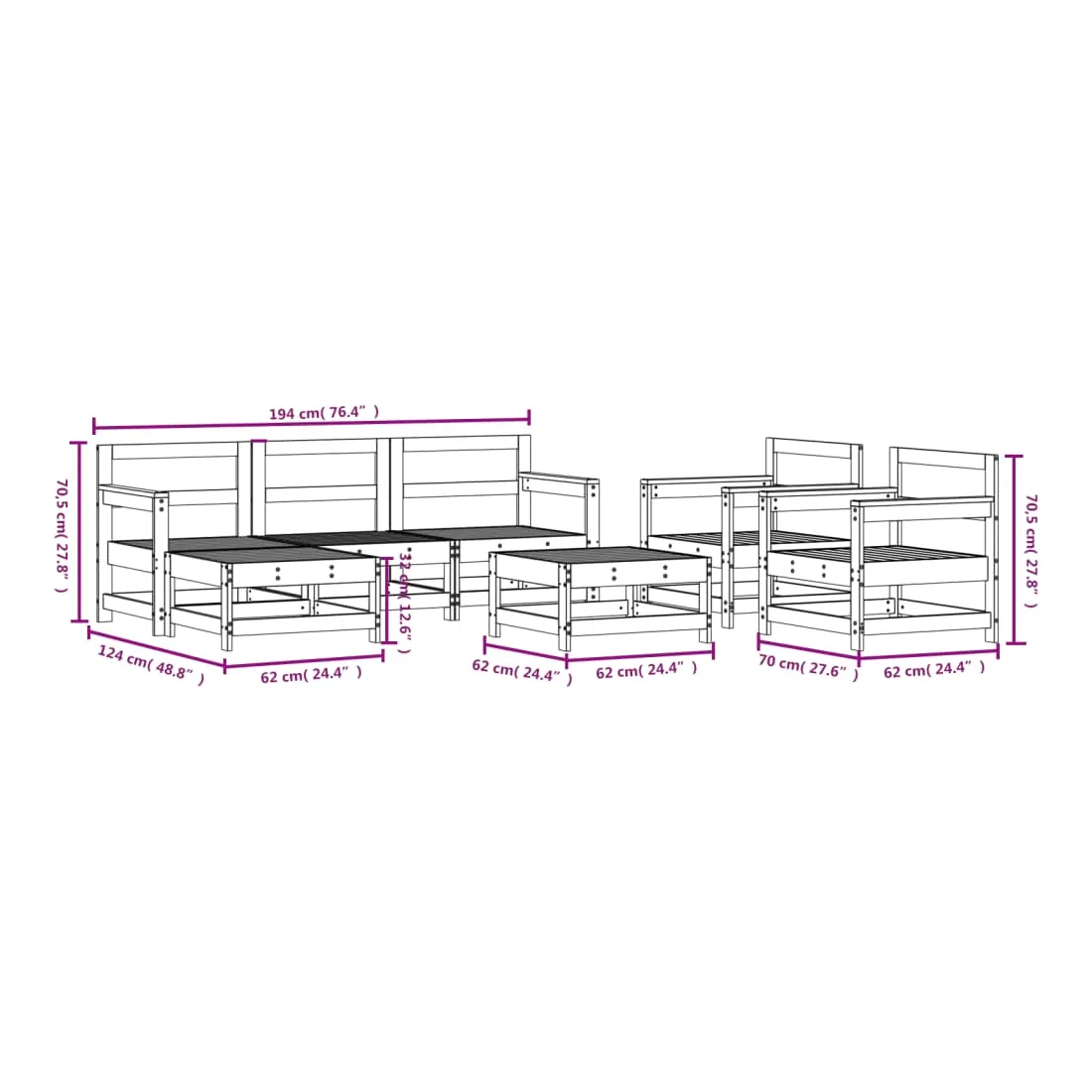 - Dimensions du fauteuil de jardin : 70 x 62 x 70,5 cm (l x P x H)