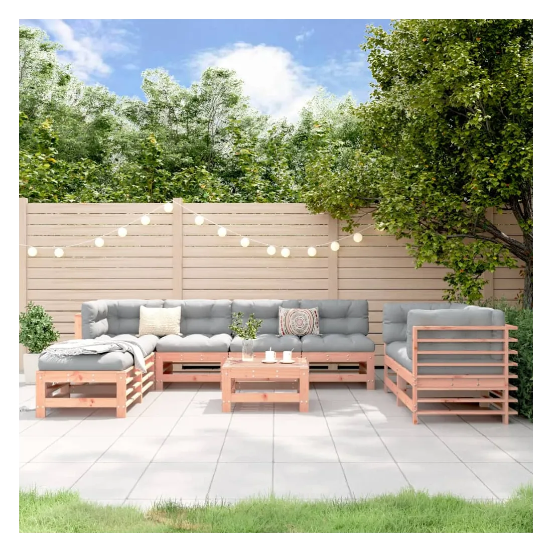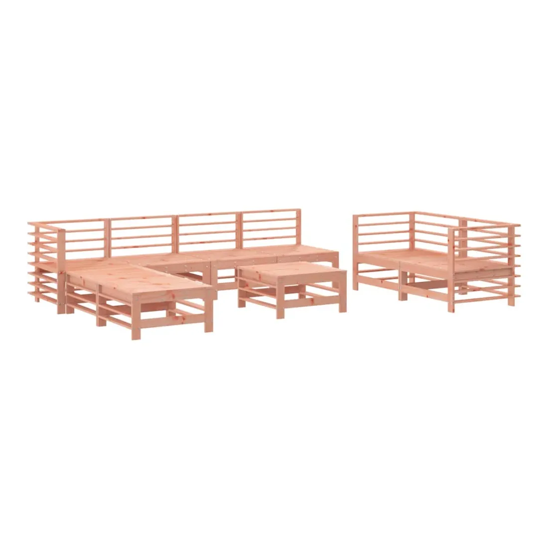 Ce salon de jardin en bois, qui se démarque par son design à lattes, sera un excellent supplément à votre jardin, patio ou terrasse pour profiter d'un moment agréable avec votre famille ou vos amis. Bois de douglas massif : le bois de douglas massif est un bois très durable qui fonctionne bien à l'extérieur. Le bois de douglas est également suffisamment solide pour être travaillé avec un minimum de soin, même sous l'influence des intempéries.Cadre robuste et stable : les cadres en bois rendent l'ensemble de salon robuste et stable pour une utilisation quotidienne à l'extérieur.Design modulaire : le canapé est flexible et facile à déplacer. Vous pouvez le combiner avec d'autres segments modulaires de la boutique en ligne pour créer vos propres configurations de salon de jardin ! Bon à savoir :Pour que vos meubles d'extérieur restent beaux, nous vous recommandons de les protéger avec une housse imperméable.Les coussins ne sont pas inclus dans la livraison.