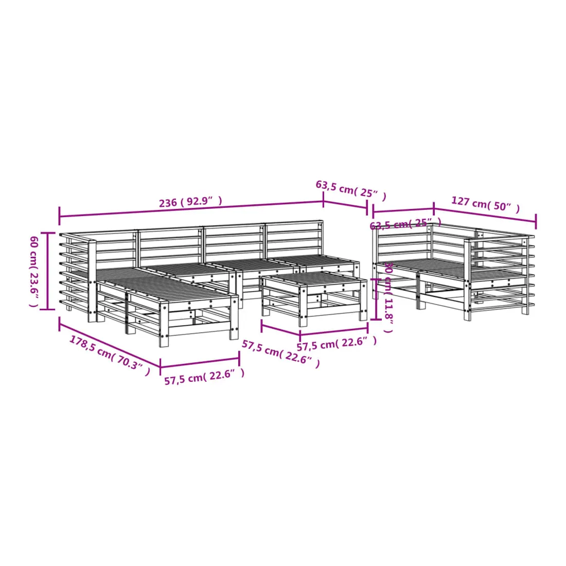 - Dimensions du canapé central : 57,5 x 63,5 x 60 cm (l x P x H)