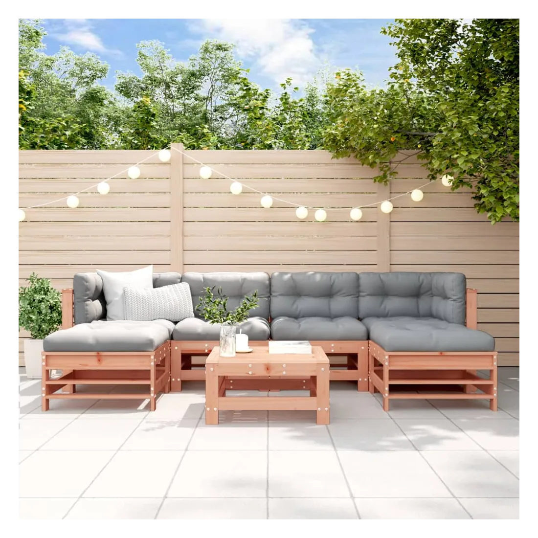 Ce salon de jardin en bois, qui se démarque par son design à lattes, sera un excellent supplément à votre jardin, patio ou terrasse pour profiter d'un moment agréable avec votre famille ou vos amis. Bois de douglas massif : le bois de douglas massif est un bois très durable qui fonctionne bien pour l'extérieur. Le bois de douglas est également suffisamment solide pour être travaillé avec un minimum de soin, même sous l'influence des intempéries.Expérience d'assise confortable : le dossier ajoute un confort d'assise supplémentaire au canapé d'extérieur.Design modulaire : le canapé est flexible et facile à déplacer. Vous pouvez le combiner avec d'autres segments modulaires de la boutique en ligne pour créer vos propres configurations de salon de jardin ! Bon à savoir :Pour que vos meubles d'extérieur restent beaux, nous vous recommandons de les protéger avec une housse imperméable.Les coussins ne sont pas inclus dans la livraison.