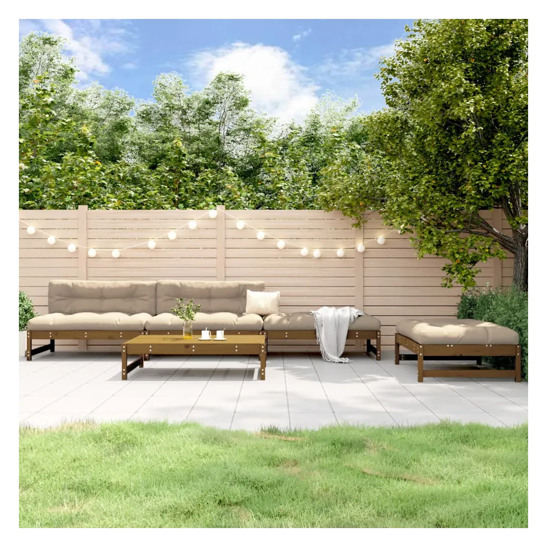Ce salon de jardin en bois, qui se démarque par son design à lattes, sera un excellent supplément à votre jardin, patio ou terrasse pour profiter d'un moment agréable avec votre famille ou vos amis. Bois de pin massif : le bois de pin massif est un matériau naturel magnifique. Le bois de pin a un grain droit et les nœuds donnent au matériau son aspect caractéristique et rustique.Cadre robuste et stable : le cadre en bois rend l'ensemble de salon robuste et stable pour une utilisation quotidienne à l'extérieur.Expérience d'assise confortable : le dossier ajoute un confort d'assise supplémentaire au canapé d'extérieur.Design modulaire : le canapé est flexible et facile à déplacer. Vous pouvez le combiner avec d'autres segments modulaires de la boutique en ligne pour créer vos propres configurations de salon de jardin ! Bon à savoir :Les coussins ne sont pas inclus dans la livraison.Pour que vos meubles d'extérieur restent beaux, nous vous recommandons de les protéger avec une housse imperméable.