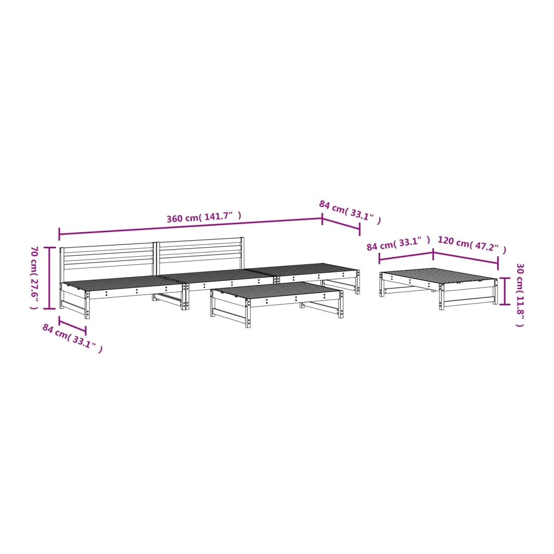 - Dimensions du repose-pied/de la table basse de jardin : 120 x 84 x 30 cm (L x l x H)