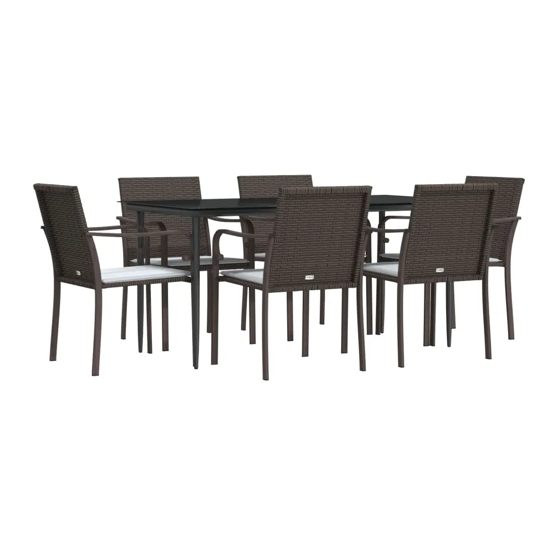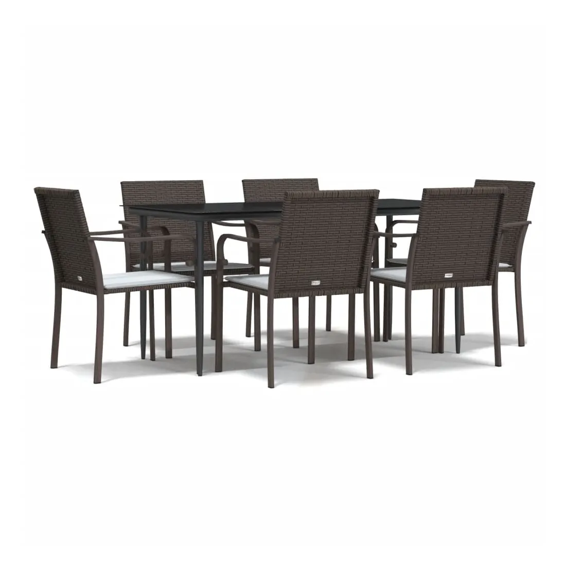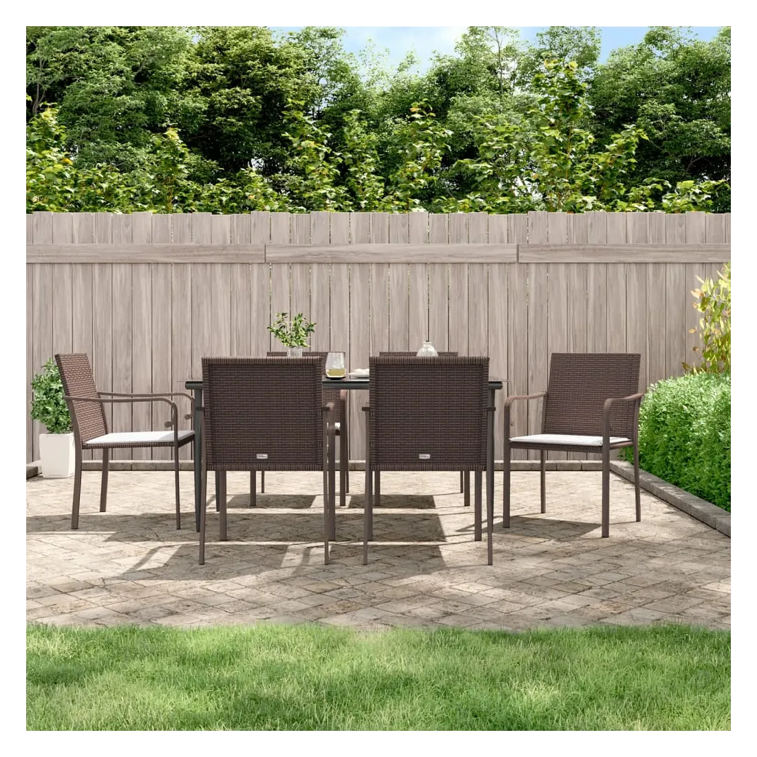 Cet ensemble à manger de jardin, combinant à la fois style et fonctionnalité, est sûrement destiné à être la pièce maîtresse de votre jardin, terrasse et de tout autre espace de vie. Matériau résistant aux intempéries : la résine tressée, également connue sous le nom de rotin poly, résiste aux intempéries et est facile à nettoyer. Elle reste belle à l'extérieur pendant une longue période. Elle offre une excellente qualité, commodité et un aspect esthétique.Cadre robuste et stable : les cadres en acier rendent l'ensemble à manger robuste et stable pour une utilisation quotidienne à l'extérieur.Dessus de table pratique : le plateau lisse de la table à manger est en verre trempé facile à nettoyer avec un chiffon humide. De plus, il offre un excellent support pour contenir vos repas, boissons et autres objets décoratifs.Assise confortable : la chaise de salle à manger est conçue avec des accoudoirs pour vous offrir une expérience d'assise confortable. Le coussin de siège épais et rembourré offre un confort ultime pendant votre temps d'assise. Remarque :Pour que vos meubles d'extérieur restent beaux, nous vous recommandons de les protéger avec une housse imperméable.